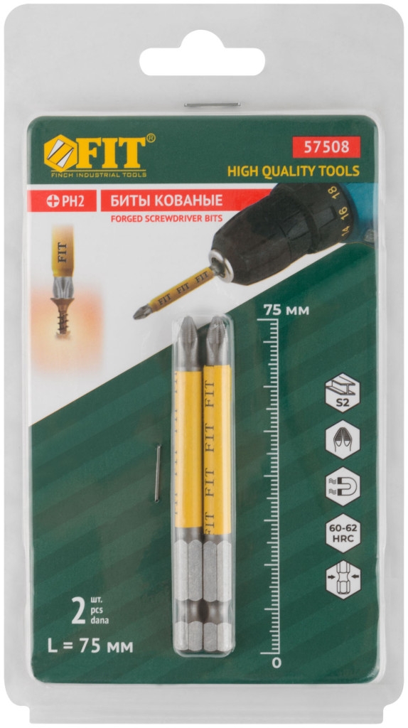Биты кованые, сталь S2, одностор. 75 мм РН2, 2шт. Профи, блистер