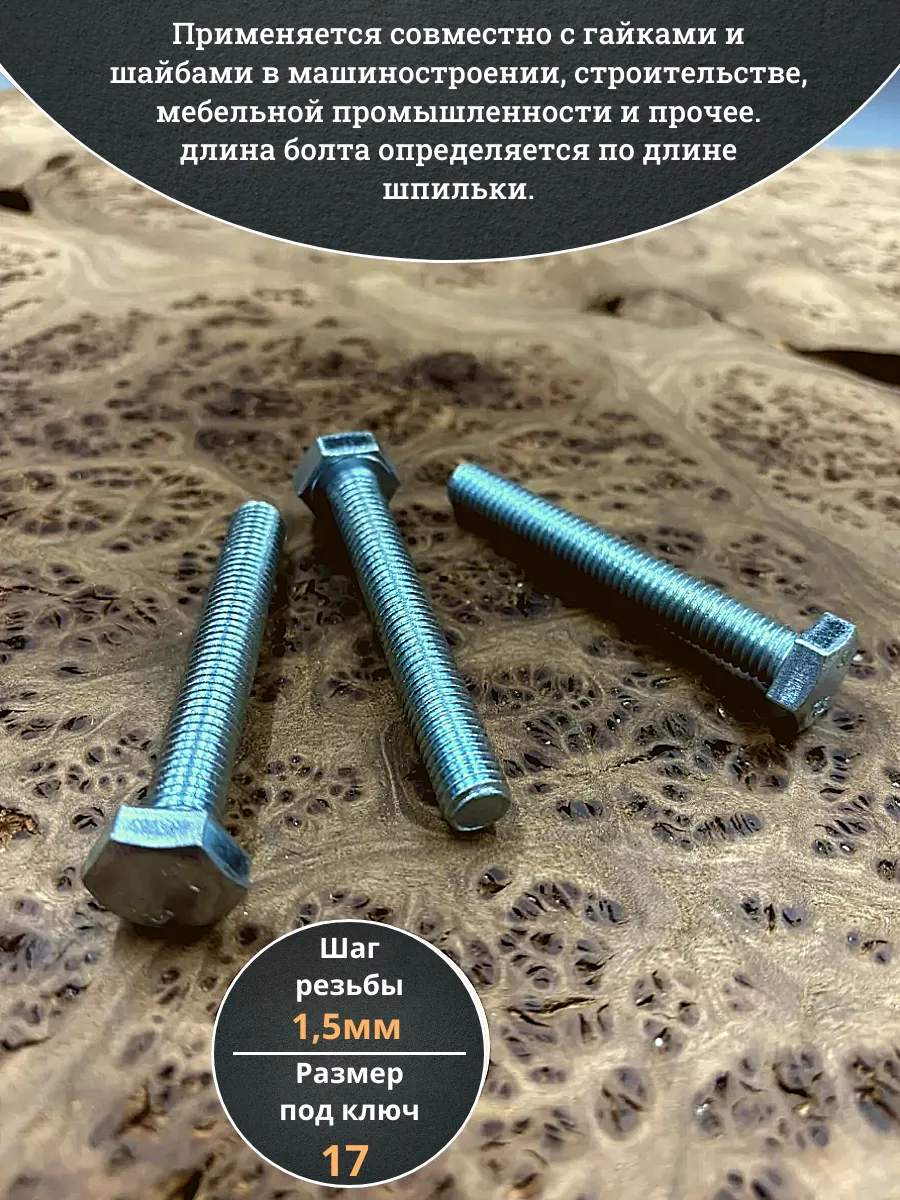 Применяется совместно с гайками и шайбами в машиностроении, строительстве, мебельной промышленности и прочее. Имеет шпильку с полной резьбой и шестигранную голову. Длина болта определяется по длине шпильке.Самый распространенный вид болтов применяется совместно с гайками и шайбами. Материал основания: Метал, дерево