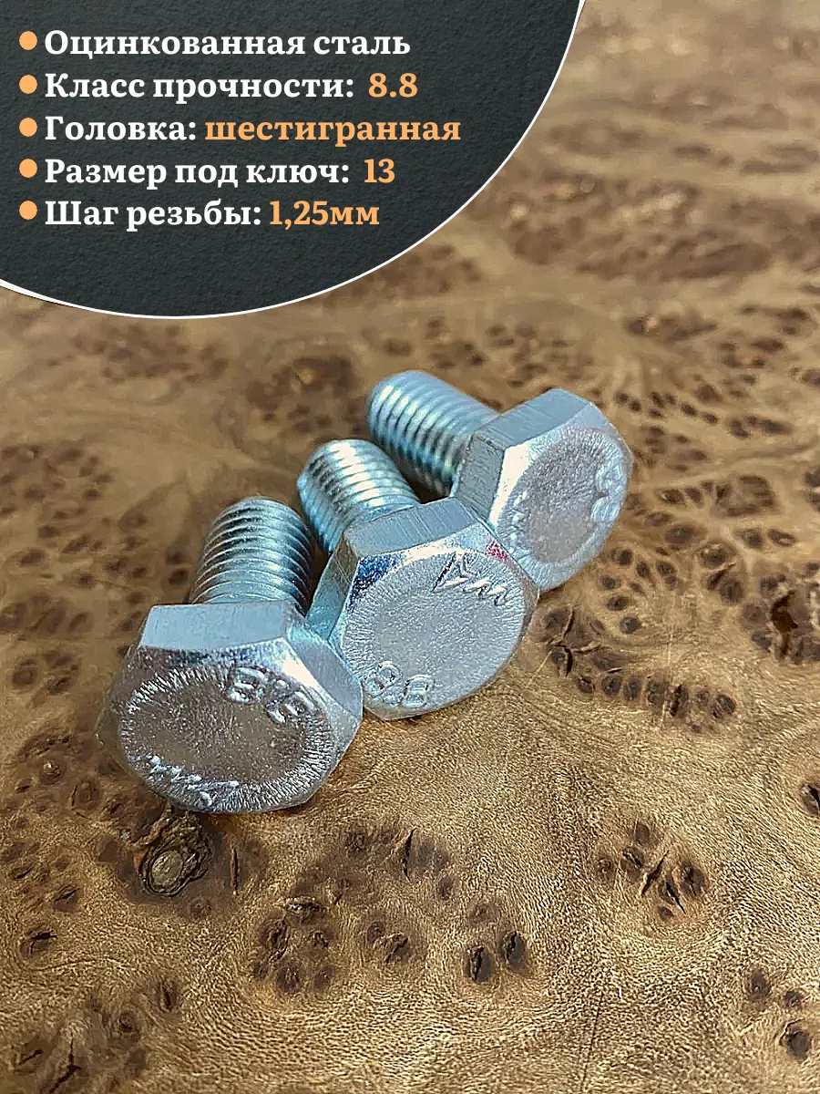 Болт, характеризующийся прочностью класса 8.8 – относится к категории высокопрочного крепежа. Данная продукция используется во многих сферах промышленного производства, для скрепления компонентов крановых конструкций, строительства мостовых пролетов, создания ж/д путей. На стержень болта может наноситься резьба одного из двух типов – полная (по всей длине стержня), либо неполная (на его части.). Шестигранная головка бывает различных размеров. Для производства применяется углеродистая сталь, в которую добавляются бор, марганец или хром либо подвергаются обработке цинком. Материал: Оцинкованная сталь 8.8