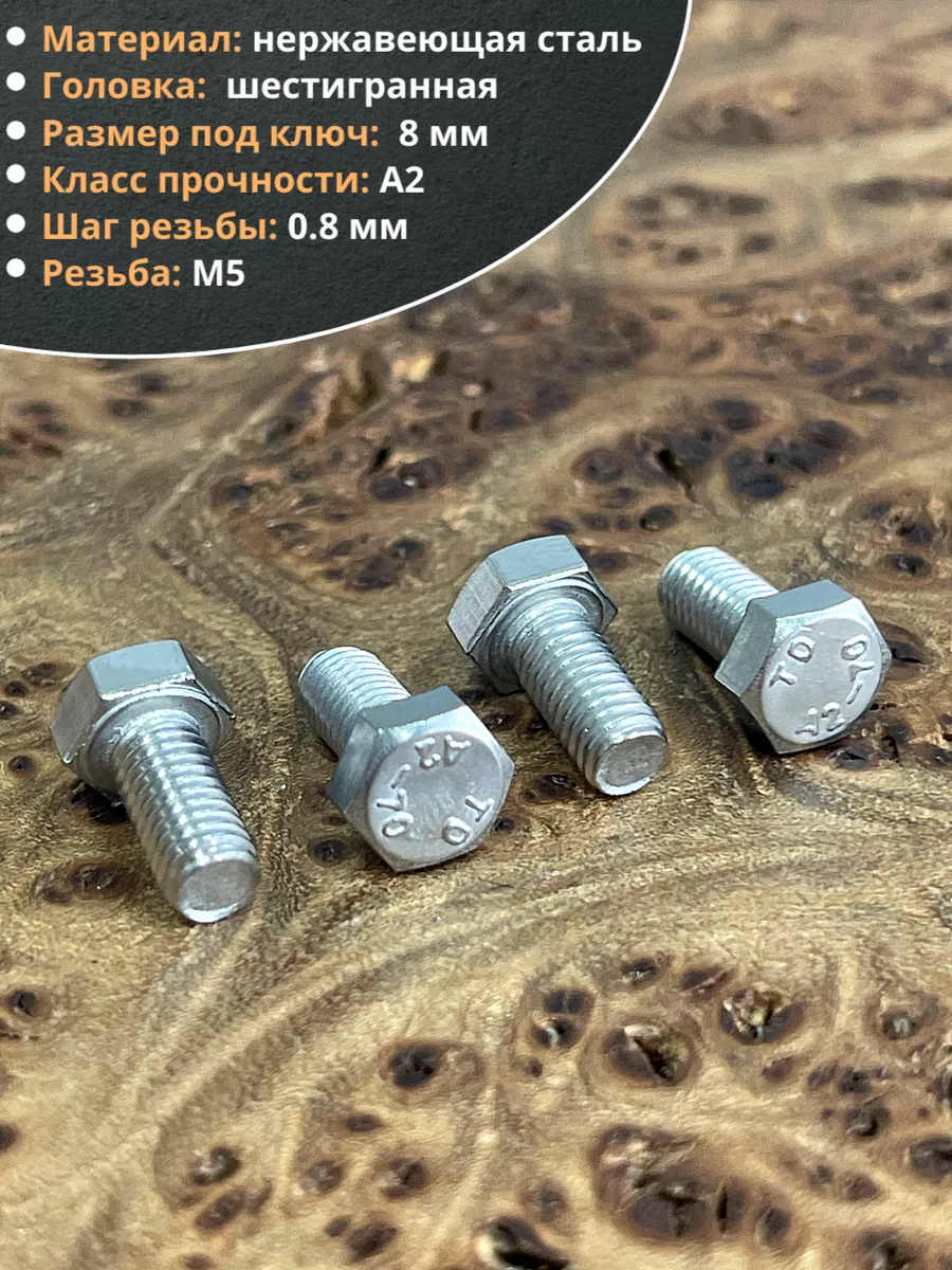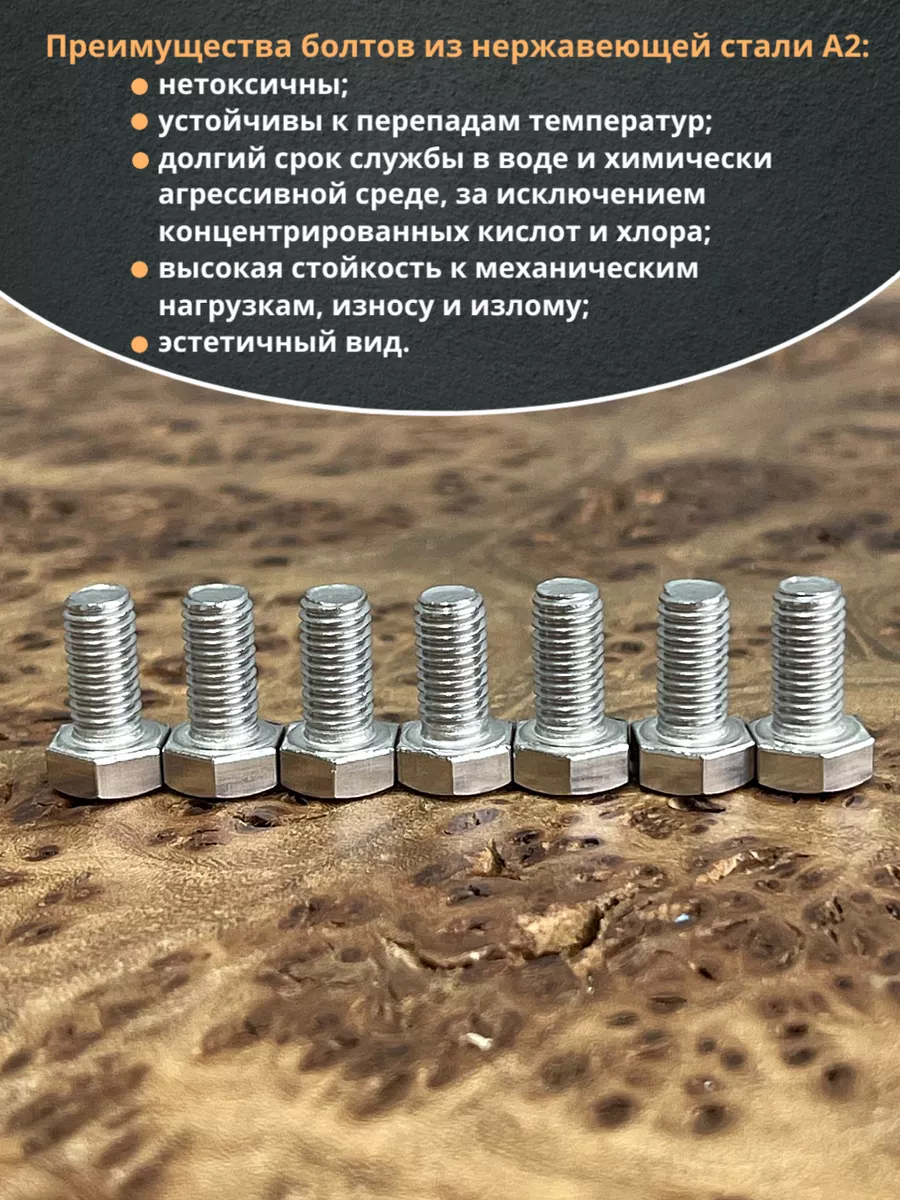Материалом для болта служит нержавеющая сталь класса A2. У изделия есть цилиндрический стержень c полной резьбой и шестигранная головка. Шляпка передает крутящий момент от ключа к крепежу при завинчивании. Для создания прочных резьбовых соединений крепеж используется в комбинации с шайбой и гайкой или завинчивается в отверстия с нарезанной резьбой. Чтобы исключить электрохимическую коррозию, шайбы с гайкой делаются из коррозионно-устойчивой стали либо нейтральных полимерных материалов.