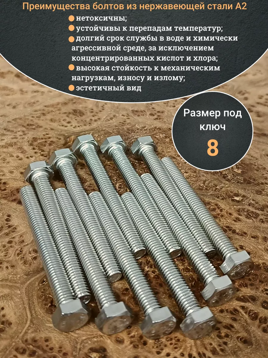 Материалом для болта служит нержавеющая сталь класса A2. У изделия есть цилиндрический стержень c полной резьбой и шестигранная головка. Шляпка передает крутящий момент от ключа к крепежу при завинчивании. Для создания прочных резьбовых соединений крепеж используется в комбинации с шайбой и гайкой или завинчивается в отверстия с нарезанной резьбой. Чтобы исключить электрохимическую коррозию, шайбы с гайкой делаются из коррозионно-устойчивой стали либо нейтральных полимерных материалов.