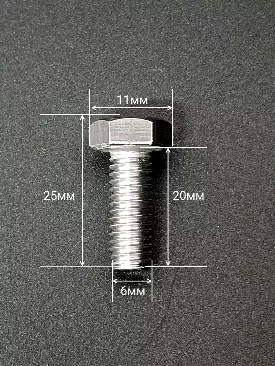Материалом для болта служит нержавеющая сталь класса A2. У изделия есть цилиндрический стержень c полной резьбой М6 и шестигранная головка. Шляпка передает крутящий момент от ключа к крепежу при завинчивании. Для создания прочных резьбовых соединений крепеж используется в комбинации с шайбой и гайкой или завинчивается в отверстия с нарезанной резьбой. Чтобы исключить электрохимическую коррозию, шайбы с гайкой делаются из коррозионно-устойчивой стали либо нейтральных полимерных материалов.