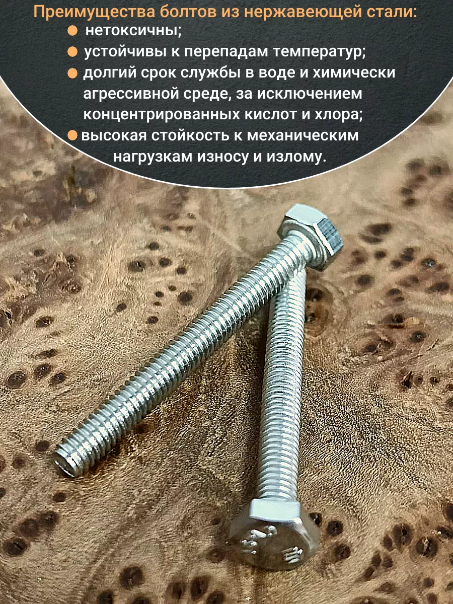 Нержавеющая сталь данной марки повышает прочность болта, который выдерживает динамические усилия и вибрацию. Изделие монтируют в помещениях и вне их. Крепеж имеет практически неограниченный ресурс работы, на который не влияет воздействие воды и изменений температуры воздуха.