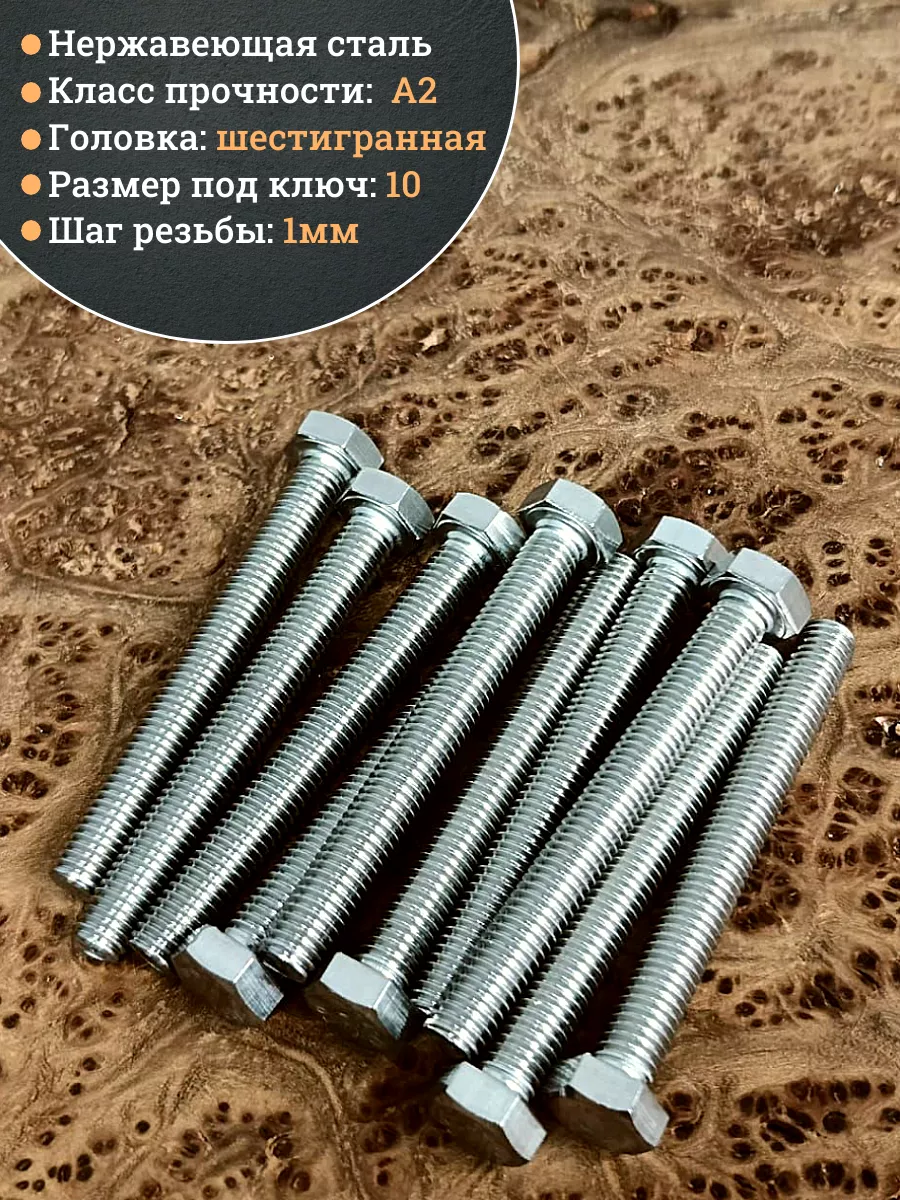 Материалом для болта служит нержавеющая сталь класса A2. У изделия есть цилиндрический стержень c полной резьбой М6 и шестигранная головка. Шляпка передает крутящий момент от ключа к крепежу при завинчивании. Для создания прочных резьбовых соединений крепеж используется в комбинации с шайбой и гайкой или завинчивается в отверстия с нарезанной резьбой. Чтобы исключить электрохимическую коррозию, шайбы с гайкой делаются из коррозионно-устойчивой стали либо нейтральных полимерных материалов.