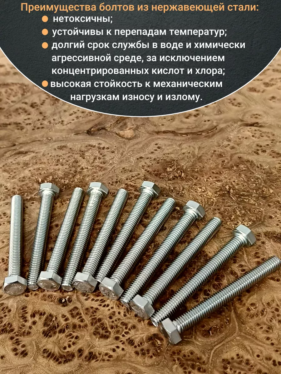 Нержавеющая сталь данной марки повышает прочность болта, который выдерживает динамические усилия и вибрацию. Изделие монтируют в помещениях и вне их. Крепеж имеет практически неограниченный ресурс работы, на который не влияет воздействие воды и изменений температуры воздуха.