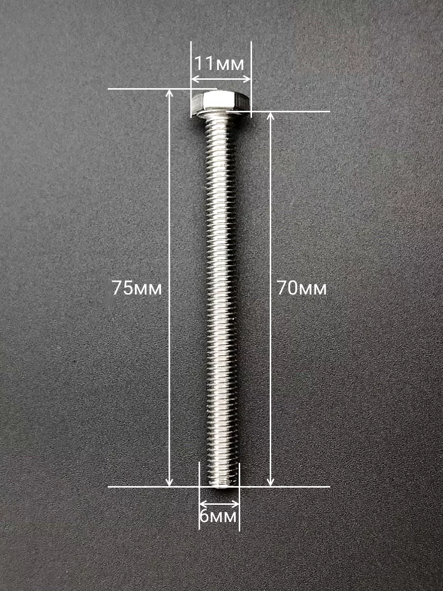 Материалом для болта служит нержавеющая сталь класса A2. У изделия есть цилиндрический стержень c полной резьбой М6 и шестигранная головка. Шляпка передает крутящий момент от ключа к крепежу при завинчивании. Для создания прочных резьбовых соединений крепеж используется в комбинации с шайбой и гайкой или завинчивается в отверстия с нарезанной резьбой. Чтобы исключить электрохимическую коррозию, шайбы с гайкой делаются из коррозионно-устойчивой стали либо нейтральных полимерных материалов.
