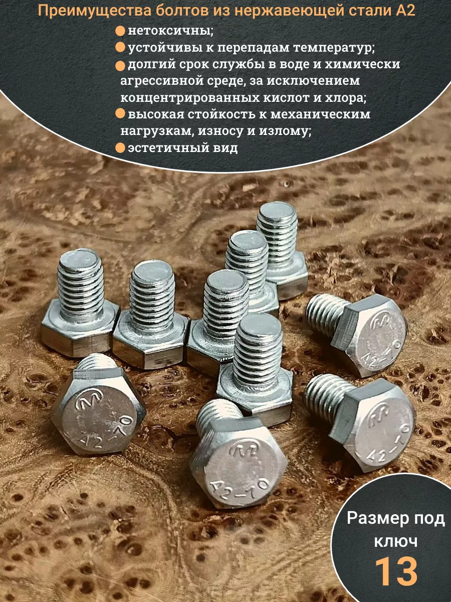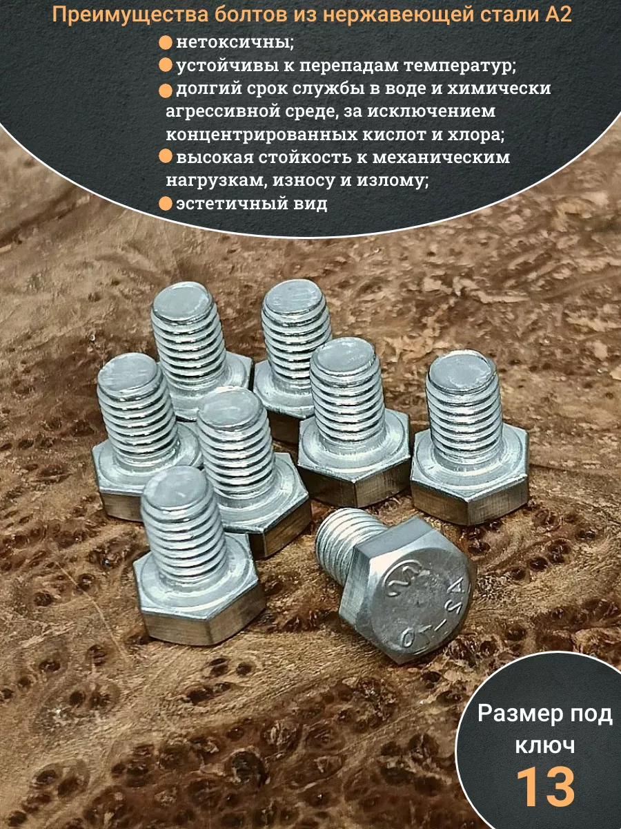 Материалом для болта служит нержавеющая сталь класса A2. У изделия есть цилиндрический стержень c полной резьбой и шестигранная головка. Шляпка передает крутящий момент от ключа к крепежу при завинчивании. Для создания прочных резьбовых соединений крепеж используется в комбинации с шайбой и гайкой или завинчивается в отверстия с нарезанной резьбой. Чтобы исключить электрохимическую коррозию, шайбы с гайкой делаются из коррозионно-устойчивой стали либо нейтральных полимерных материалов.