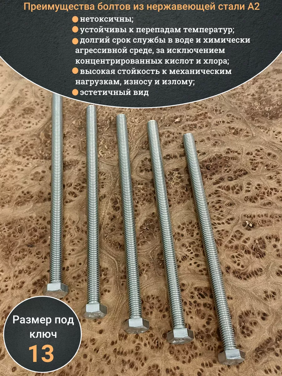 Материалом для болта служит нержавеющая сталь класса A2. У изделия есть цилиндрический стержень c полной резьбой и шестигранная головка. Шляпка передает крутящий момент от ключа к крепежу при завинчивании. Для создания прочных резьбовых соединений крепеж используется в комбинации с шайбой и гайкой или завинчивается в отверстия с нарезанной резьбой. Чтобы исключить электрохимическую коррозию, шайбы с гайкой делаются из коррозионно-устойчивой стали либо нейтральных полимерных материалов.