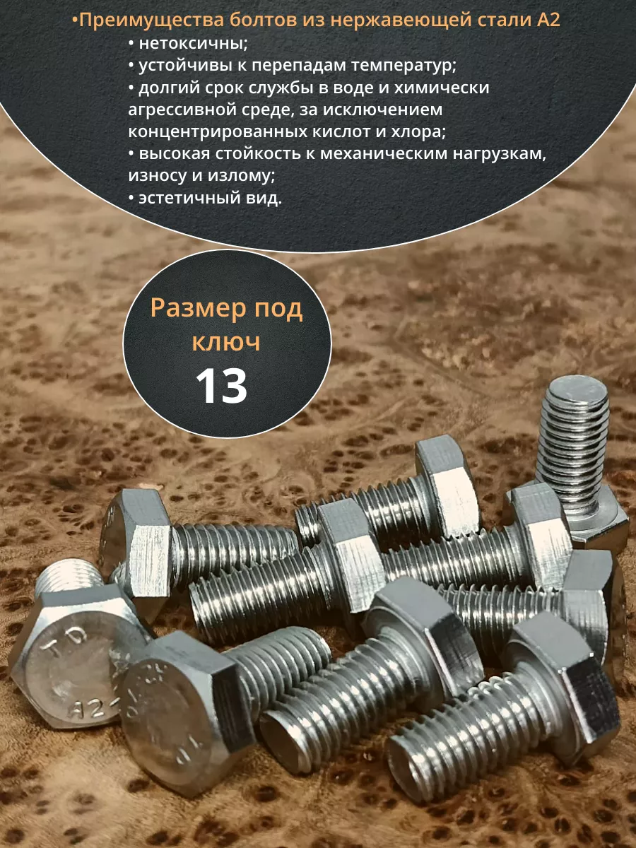Материалом для болта служит нержавеющая сталь класса A2. У изделия есть цилиндрический стержень c полной резьбой М8 и шестигранная головка. Шляпка передает крутящий момент от ключа к крепежу при завинчивании. Для создания прочных резьбовых соединений крепеж используется в комбинации с шайбой и гайкой или завинчивается в отверстия с нарезанной резьбой. Чтобы исключить электрохимическую коррозию, шайбы с гайкой делаются из коррозионно-устойчивой стали либо нейтральных полимерных материалов.