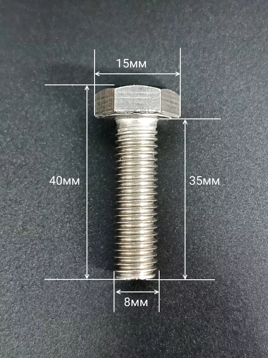 Материалом для болта служит нержавеющая сталь класса A2. У изделия есть цилиндрический стержень c полной резьбой М8 и шестигранная головка. Шляпка передает крутящий момент от ключа к крепежу при завинчивании. Для создания прочных резьбовых соединений крепеж используется в комбинации с шайбой и гайкой или завинчивается в отверстия с нарезанной резьбой. Чтобы исключить электрохимическую коррозию, шайбы с гайкой делаются из коррозионно-устойчивой стали либо нейтральных полимерных материалов.