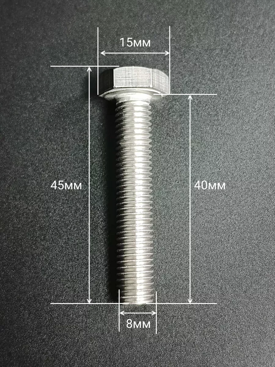 Материалом для болта служит нержавеющая сталь класса A2. У изделия есть цилиндрический стержень c полной резьбой М8 и шестигранная головка. Шляпка передает крутящий момент от ключа к крепежу при завинчивании. Для создания прочных резьбовых соединений крепеж используется в комбинации с шайбой и гайкой или завинчивается в отверстия с нарезанной резьбой. Чтобы исключить электрохимическую коррозию, шайбы с гайкой делаются из коррозионно-устойчивой стали либо нейтральных полимерных материалов.
