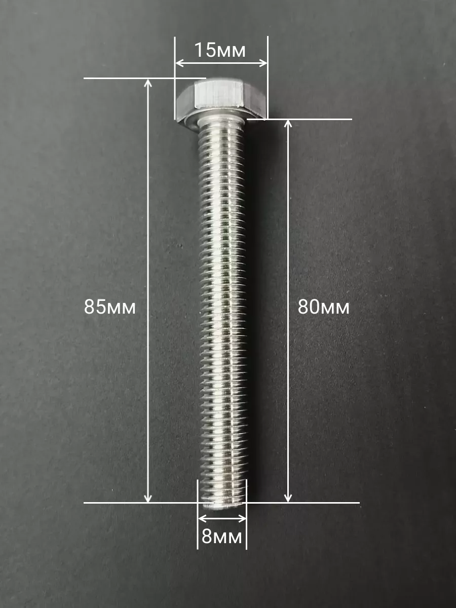 Материалом для болта служит нержавеющая сталь класса A2. У изделия есть цилиндрический стержень c полной резьбой М8 и шестигранная головка. Шляпка передает крутящий момент от ключа к крепежу при завинчивании. Для создания прочных резьбовых соединений крепеж используется в комбинации с шайбой и гайкой или завинчивается в отверстия с нарезанной резьбой. Чтобы исключить электрохимическую коррозию, шайбы с гайкой делаются из коррозионно-устойчивой стали либо нейтральных полимерных материалов.