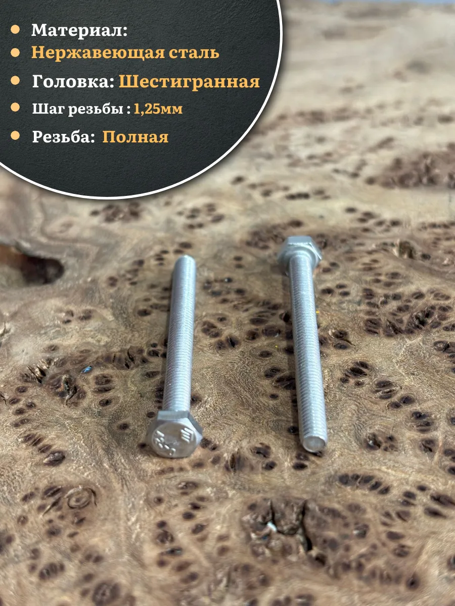 Материалом для болта служит нержавеющая сталь класса A2. У изделия есть цилиндрический стержень c полной резьбой и шестигранная головка. Шляпка передает крутящий момент от ключа к крепежу при завинчивании. Для создания прочных резьбовых соединений крепеж используется в комбинации с шайбой и гайкой или завинчивается в отверстия с нарезанной резьбой. Чтобы исключить электрохимическую коррозию, шайбы с гайкой делаются из коррозионно-устойчивой стали либо нейтральных полимерных материалов.