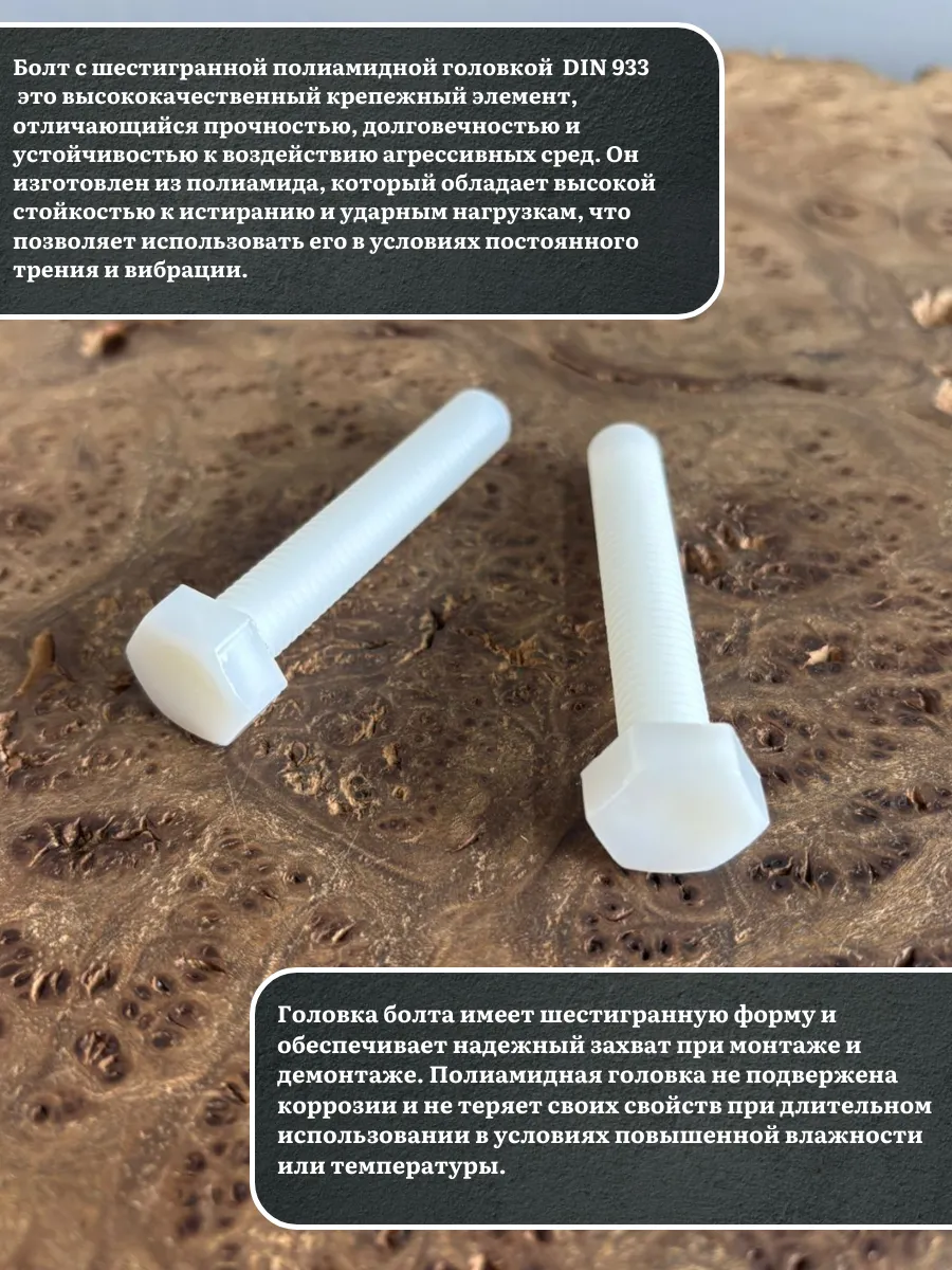 Болт с шестигранной головкой из полиамида (пластика) DIN 933, полная резьба, обладает прочностью, хорошими теплоизоляционными характеристиками и отличными антикоррозийными свойствами. Резьба на данных изделиях - метрическая, наносят ее методом горячей накатки.