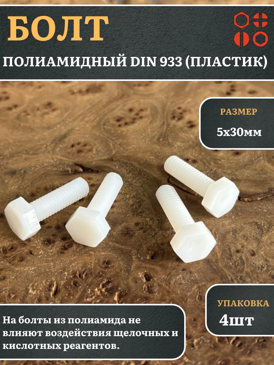 Болт полиамидный 5х30 мм DIN 933 (пластик), 4 шт.