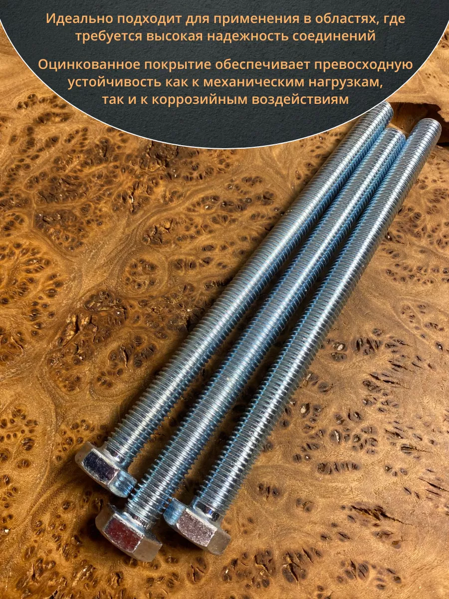 Болт с полной резьбой применяется в легких конструкциях либо, где действует нагрузка, направленная вдоль стержня крепежа. Болт устанавливается в одну конструкцию и фиксирует другую за счет плотно насаженной гайки. Полная резьба болта позволяет применять его при различных размерах скрепляемых элементов. Болт, класс прочности которого 8.8, 10.9 или 12.9 относится к высокопрочным изделиям. Болтовое соединение является очень надежным, что особенно важно при скреплении металлических конструкций. Имеет достаточный антикоррозионный защитный слой. Материал: Оцинкованная сталь 8.8