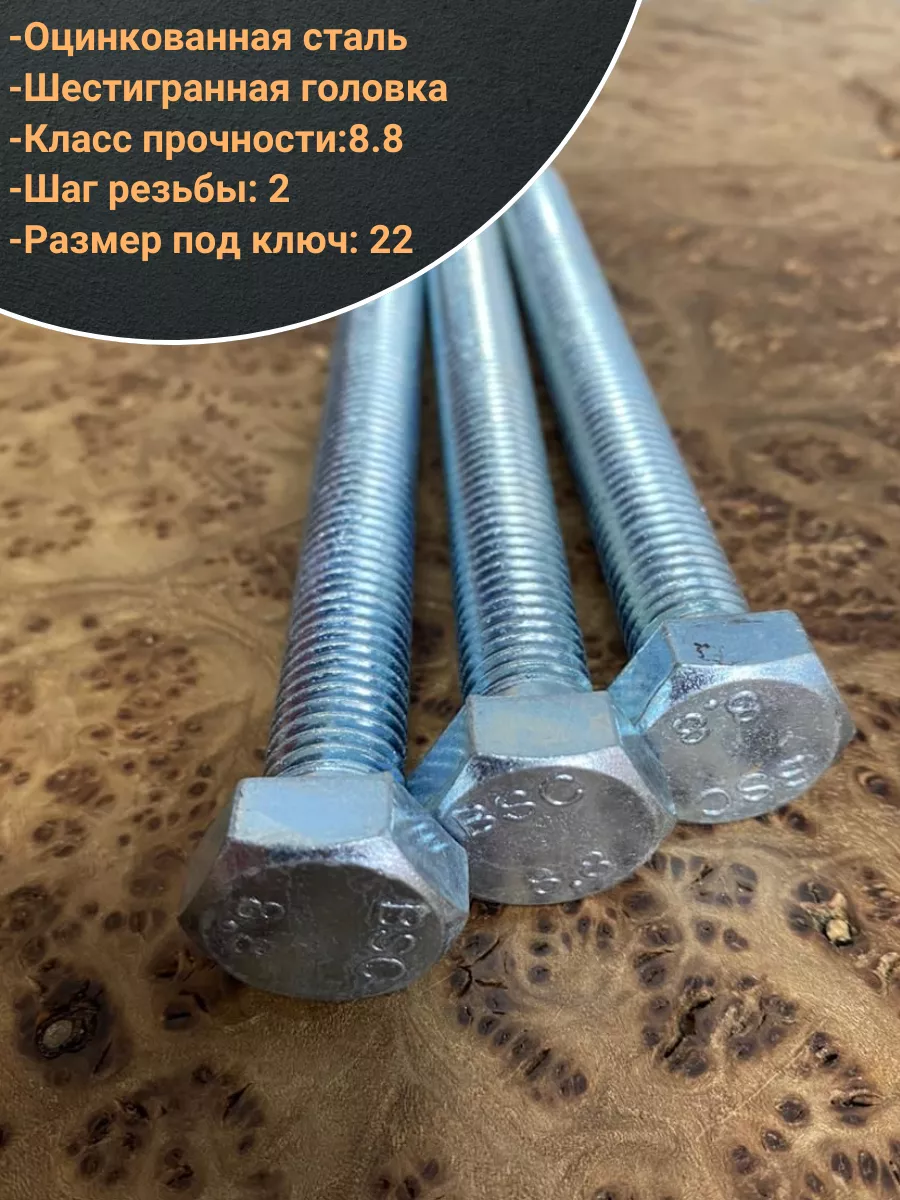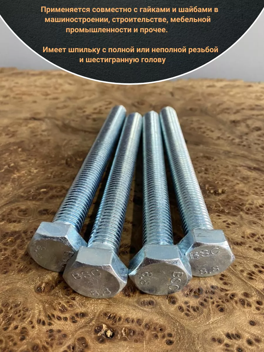 Болт, характеризующийся прочностью класса 8.8 – относится к категории высокопрочного крепежа. Данная продукция используется во многих сферах промышленного производства, для скрепления компонентов крановых конструкций, строительства мостовых пролетов, создания ж/д путей. На стержень болта может наноситься резьба одного из двух типов – полная (по всей длине стержня), либо неполная (на его части.). Шестигранная головка бывает различных размеров. Для производства применяется углеродистая сталь, в которую добавляются бор, марганец или хром либо подвергаются обработке цинком. Материал: Оцинкованная сталь 8.8. Применяется совместно с гайками и шайбами в машиностроении, строительстве, мебельной промышленности и прочее. Имеет шпильку с полной или неполной резьбой и шестигранную голову. Длина болта определяется по длине шпильки.