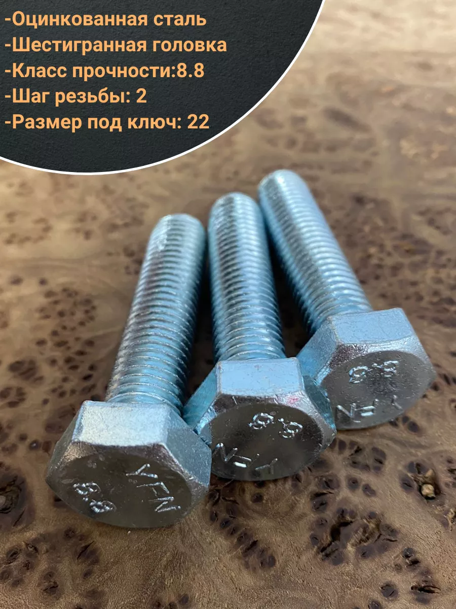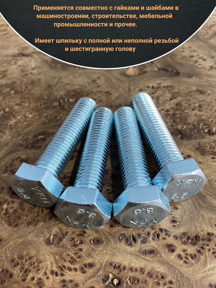 Болт, характеризующийся прочностью класса 8.8 – относится к категории высокопрочного крепежа. Данная продукция используется во многих сферах промышленного производства, для скрепления компонентов крановых конструкций, строительства мостовых пролетов, создания ж/д путей. На стержень болта может наноситься резьба одного из двух типов – полная (по всей длине стержня), либо неполная (на его части.). Шестигранная головка бывает различных размеров. Для производства применяется углеродистая сталь, в которую добавляются бор, марганец или хром либо подвергаются обработке цинком. Материал: Оцинкованная сталь 8.8. Применяется совместно с гайками и шайбами в машиностроении, строительстве, мебельной промышленности и прочее. Имеет шпильку с полной или неполной резьбой и шестигранную голову. Длина болта определяется по длине шпильки.