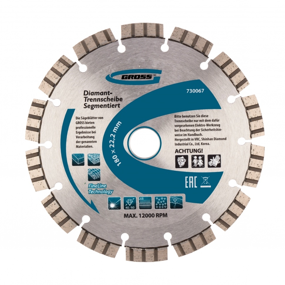 Алмазный диск Gross ф180х22,2 мм 7300067 с лазерной приваркой турбо-сегментов предназначен для сухого резания бетона, в том числе свежего, слабоармированного железобетона, кирпича, песчаника и гранита. Посадочный диаметр 22,2 мм позволяет использовать диск в качестве расходного инструмента для УШМ. Турбо-сегменты обеспечивают быстрое сухое резание без необходимости водяного охлаждения. За счет оптимально подобранной связки диск выдерживает перегрузки и подходит как для интенсивного бытового, так и для профессионального применения, когда требуется выполнить большой объем работ.Преимущества Турбо-сегментная форма &mdash диск универсален по своему применению, позволяет быстро резать материалы, в т.ч. слабоармированный бетон без риска деформации. Лазерная приварка турбо-сегментов &mdash режущий алмазный слой прочно фиксируются на корпусе, такая технология изготовления гарантирует надежность диска и высокую стойкость к нагрузкам. Ширина алмазного слоя 10 мм &mdash диск гарантирует высокую производительность выполн