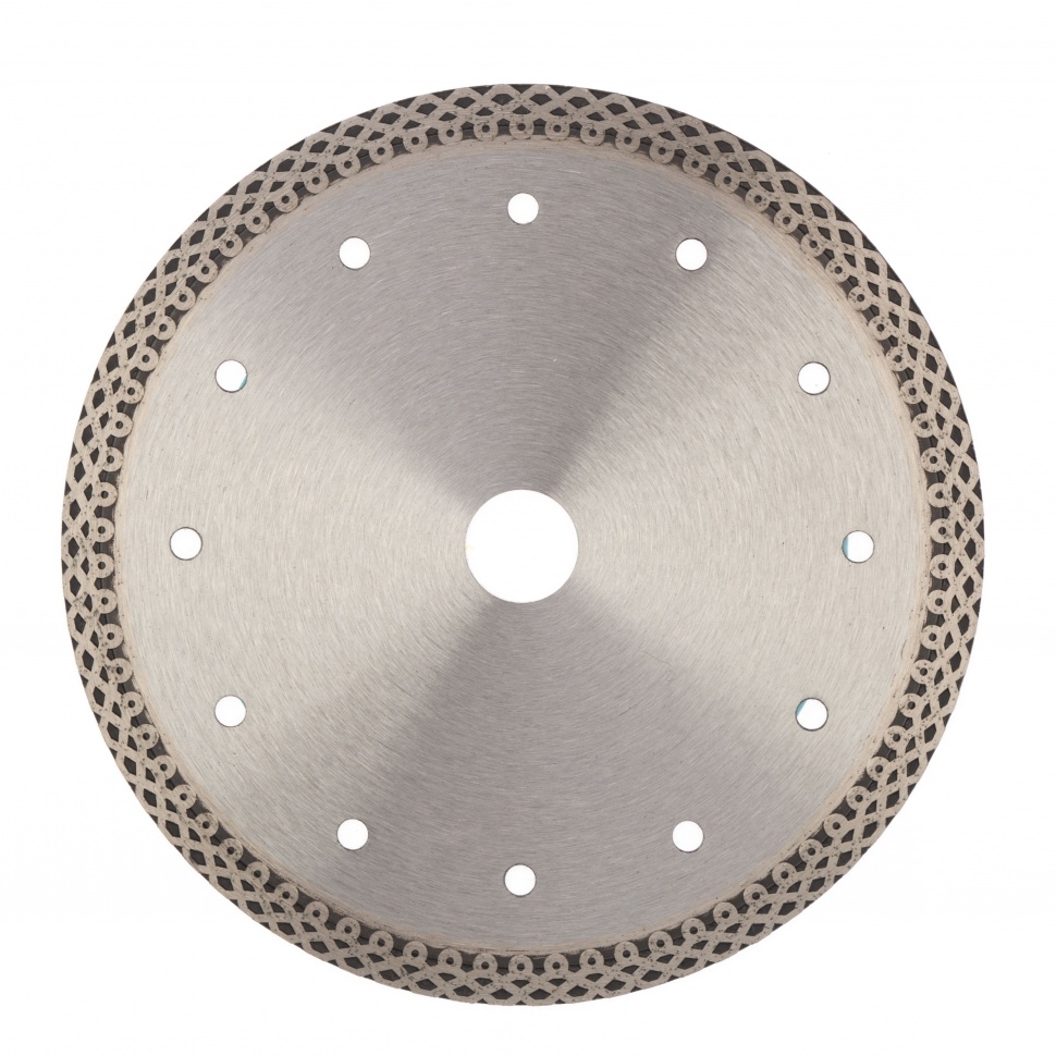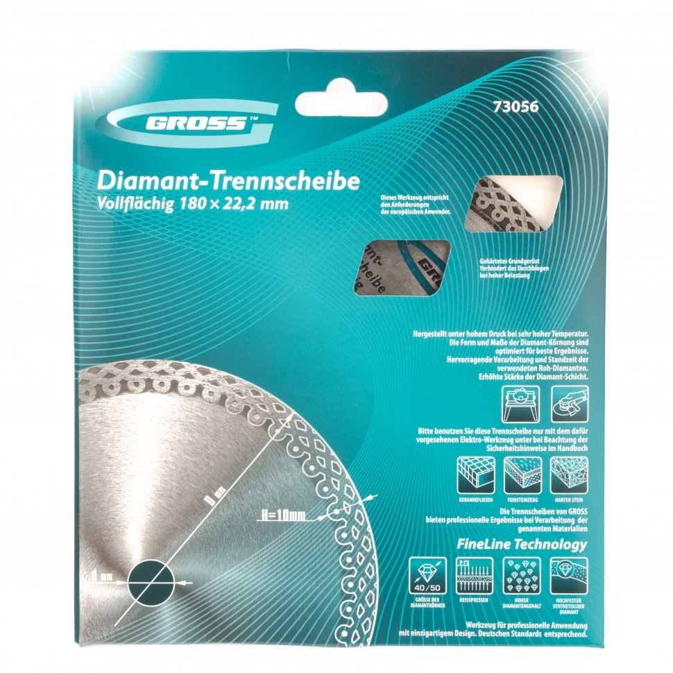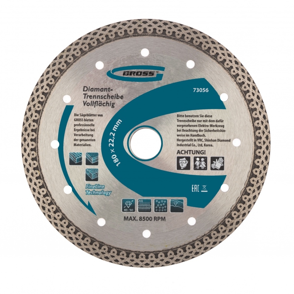 Тонкий сплошной алмазный диск Gross Jaguar ф180х22,2 мм 73056, мокрое резание, подходит для профессионального использования с УШМ или плиткорезами соответствующего типоразмера. Он используется для резки мокрым методом твердых материалов: гранита, керамогранита, плитки, мрамора и камня. Диск оставляет ровный срез без трещин и сколов за счет сплошной формы. При мокрой резке вода охлаждает диск и удаляет пыль с рабочей зоны, поэтому он легко справляется с большими объемами работ. Тонкий диск 1,2 мм значительно увеличивает скорость реза.Преимущества Продуманная форма рабочей части не только позволяет проводить мокрое шлифование, но и допускает кратковременное сухое резание материалов. В процессе изготовления диска используется горячее прессование, исключающее изъяны и гарантирующее точную форму. Высокая концентрация алмазов размером 40-50 мкм на широкой режущей части (10 мм) увеличивает производительность независимо от скорости реза. Качественные компоненты связки (кобальт, серебро и др.) обеспечивают высокий рес