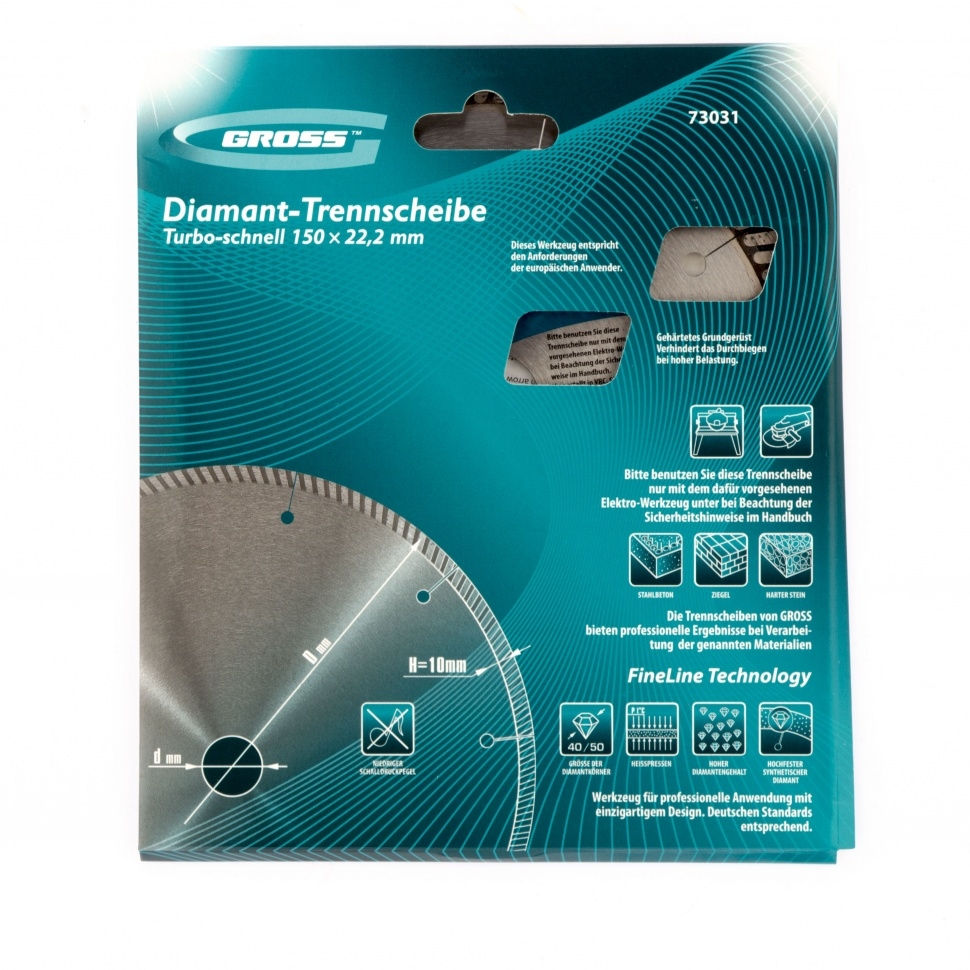 Алмазный диск Gross ф150х22,2 мм 73031 турбо с лазерной перфорацией применяется для сухого резания твердых материалов: бетона, в том числе свежего, железобетона, кирпича, гранита, камня и песчаника. Возможность работы с разными типами материалов обусловлена оптимально подобранной металлической связкой. Инструмент используется в качестве расходника на профессиональных УШМ. Лазерная перфорация обеспечивает усиленное охлаждение диска, поэтому он оптимален для интенсивной эксплуатации.Преимущества Турбированная форма рабочей части позволяет проводить быстрое резание сухим методом без необходимости использования водяного охлаждения. Диск отличается износостойкостью и высокой скоростью резки, благодаря режущей части с высокой концентрацией алмазов 40-50 мкм. В качестве связки используются только качественные компоненты (кобальт, серебро и др.), это позволяет повысить ее устойчивость к перегрузкам, перегреву и увеличить ресурс диска. Ширина рабочей части составляет 10 мм, поэтому инструмент обеспечивает высокий ресу