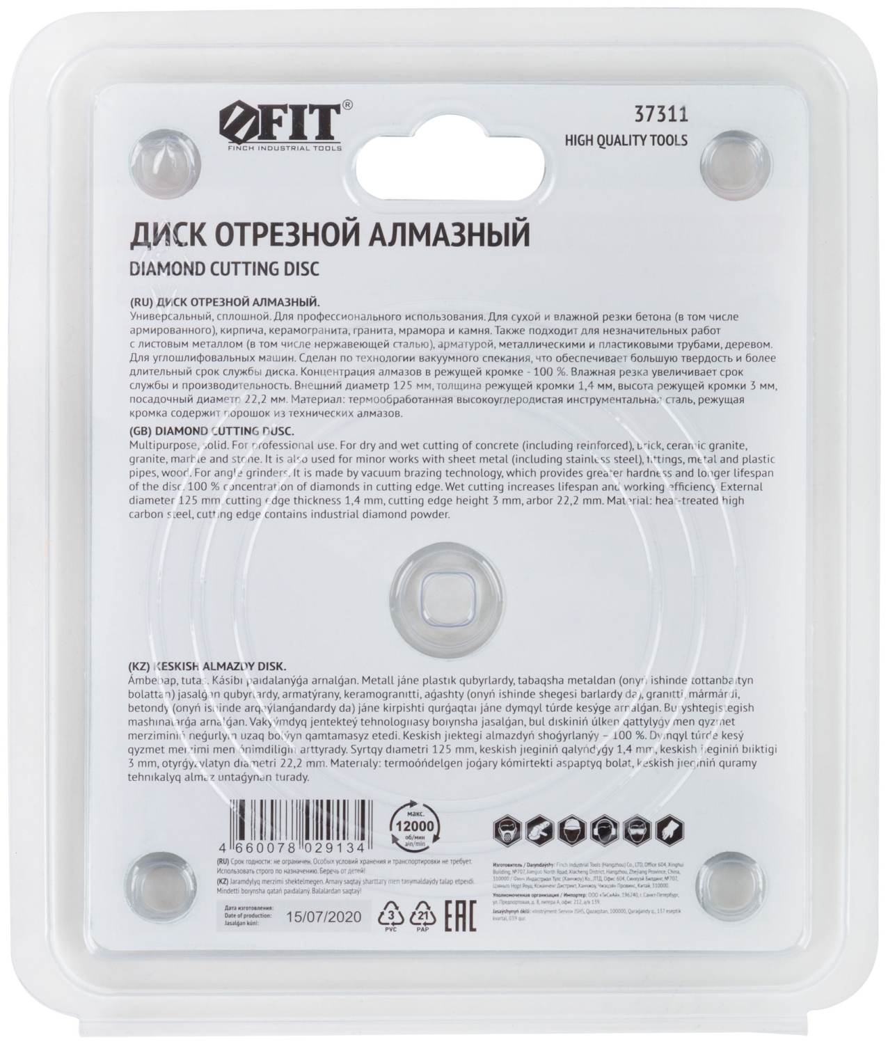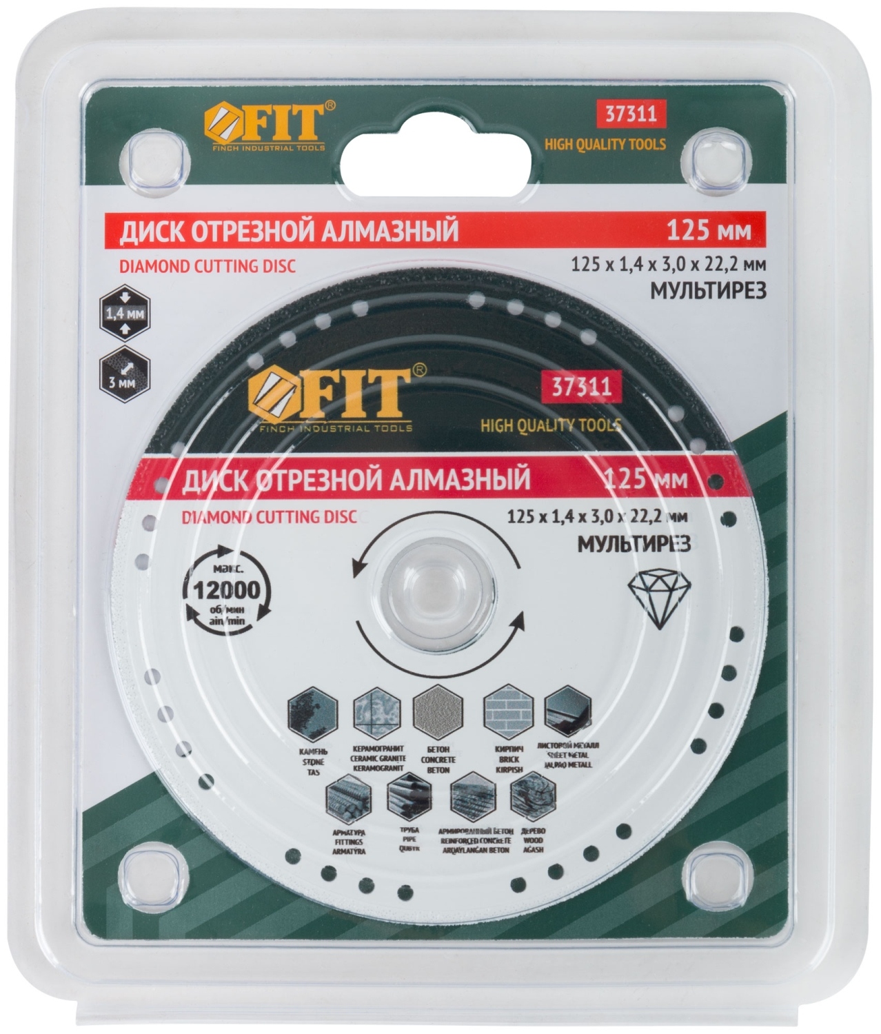 «Мультирез». Универсальный сплошной. Изготовлен по технологии вакуумного спекания. Для сухой и влажной резки. Высокая плотность расположения алмазов в режущем слое позволяет использовать диск для резки бетона, кирпича, гранита, мрамора и камня, арматуры, металлического профиля. Посадочный диаметр 22,2 мм. Материал: термообработанная высокоуглеродистая инструментальная сталь, режущая кромка содержит порошок из=технических алмазов. Упаковка: блистер.