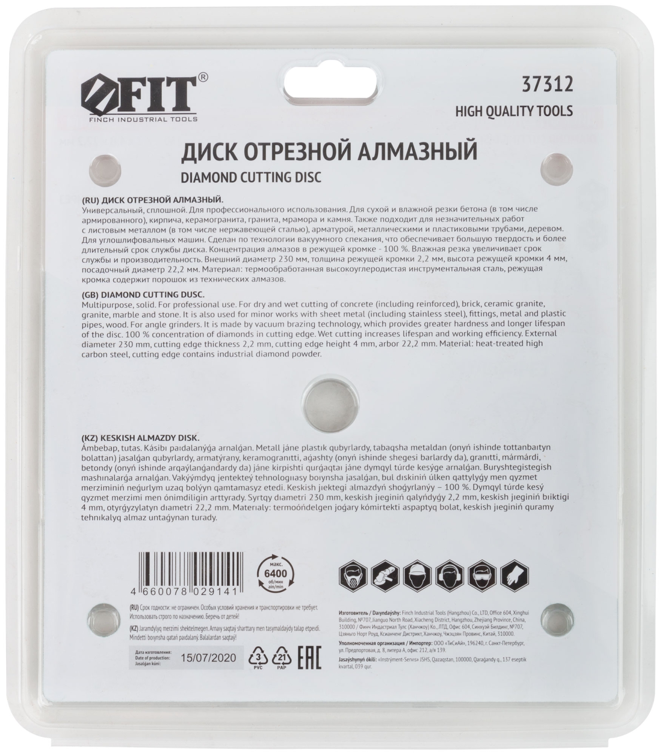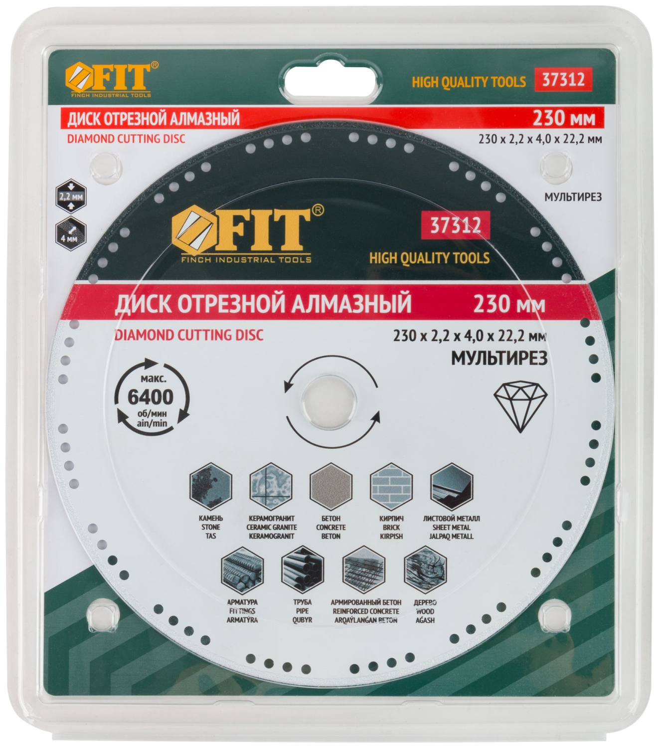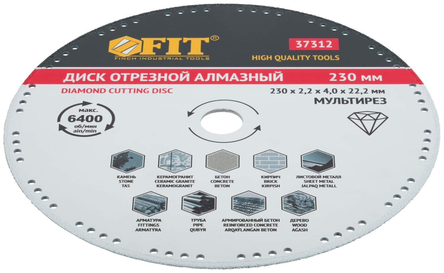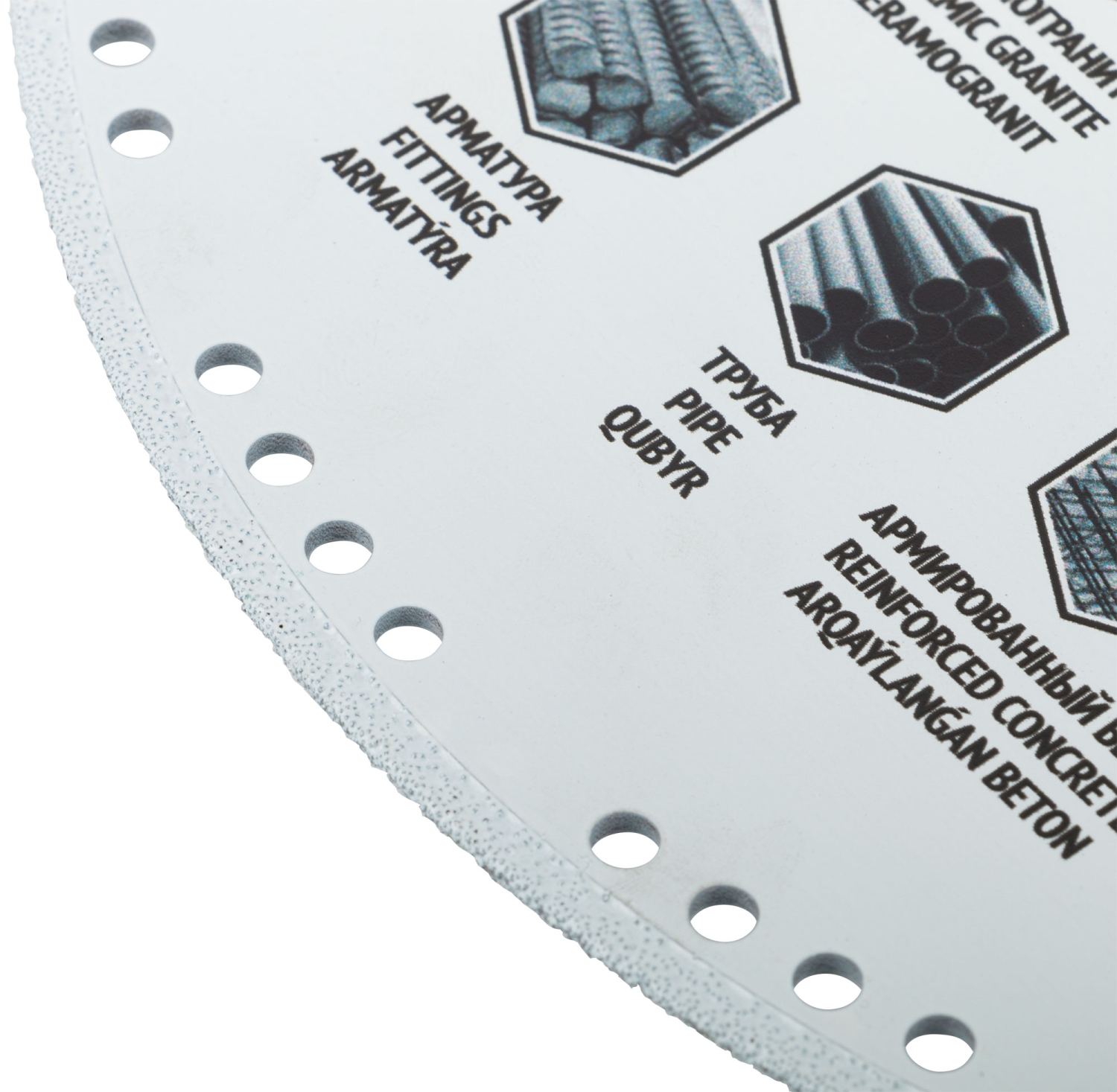 «Мультирез». Универсальный сплошной. Изготовлен по технологии вакуумного спекания. Для сухой и влажной резки. Высокая плотность расположения алмазов в режущем слое позволяет использовать диск для резки бетона, кирпича, гранита, мрамора и камня, арматуры, металлического профиля. Посадочный диаметр 22,2 мм. Материал: термообработанная высокоуглеродистая инструментальная сталь, режущая кромка содержит порошок из=технических алмазов. Упаковка: блистер.
