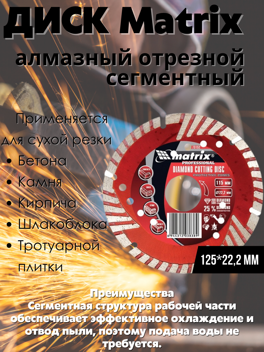 | Диск отрезной алмазный сегментный с защитн.сект. сухая резка 115х22,2 мм Matrix | 73152 | 1 шт. |