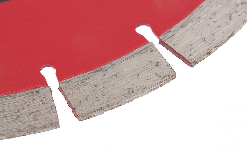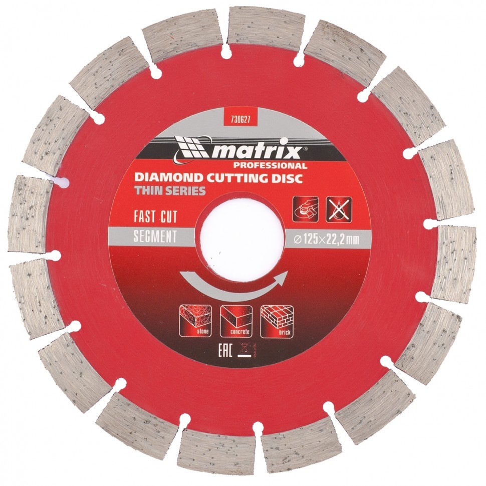 Отрезной сегментный алмазный диск Matrix ф125х22,2 мм 730627, тонкий, позволяет проводить сухое резание свежего и старого бетона, камня, гранита, шлакоблока, тротуарной плитки, песчаника и кирпича с помощью УШМ. Его можно использовать как в частной мастерской, так и на стройке для решения профессиональных задач. Тонкий корпус диска способствует снижению нагрузки на инструмент, позволяя ускорить рабочий процесс на 20%.Преимущества 16 сегментов позволяют быстро проводить работы по различным материалам без водяного охлаждения диска. За счет ширины режущего слоя 10 мм и высокой концентрации алмазов диск быстро разрезает материалы без риска преждевременного износа. Плотная металлическая связка отлично удерживает алмазы, обеспечивая их равномерное истирание, своевременную раскрываемость и полную выработку. Технология ускоренного горячего прессования делает диск устойчивым к высоким нагрузкам и износу.