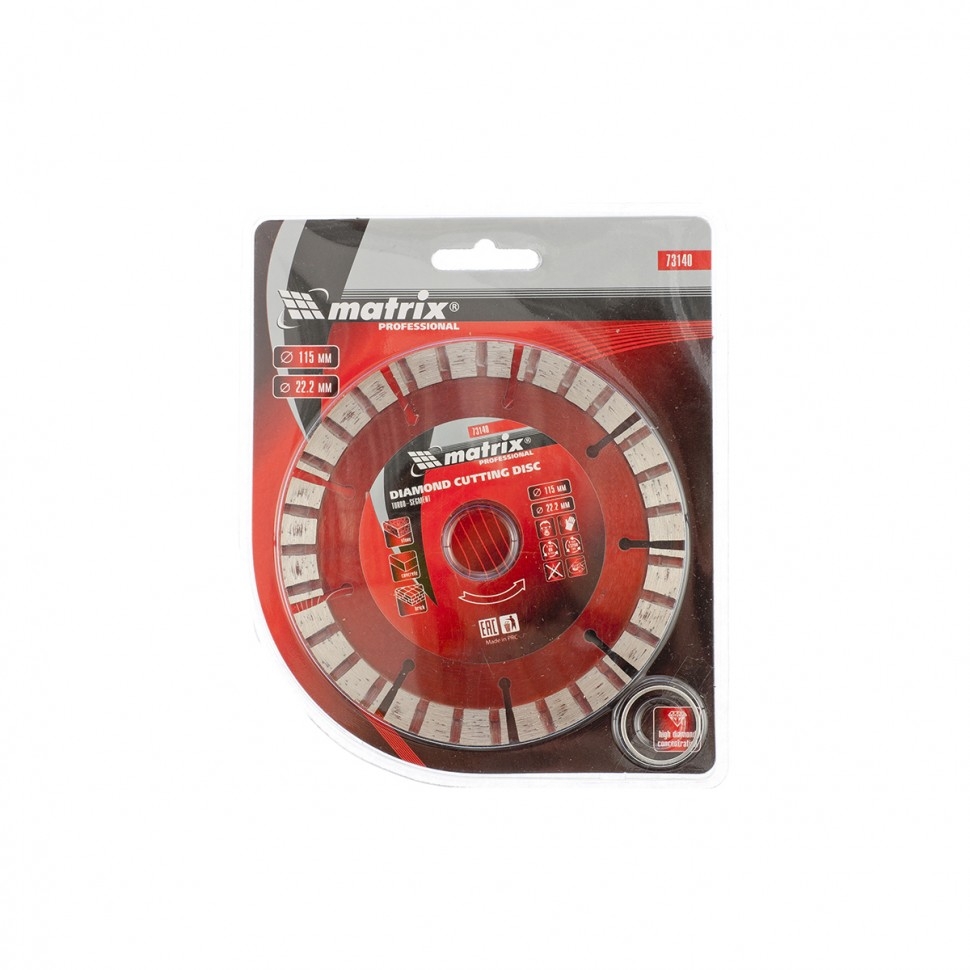 Турбо-сегментный отрезной алмазный диск Matrix 73140, 115 х 22,2 мм, предназначен для сухой резки бетона различной прочности, камня, кирпича, тротуарной плитки, шлакоблока. Он устанавливается на углошлифовальные машины с посадочным отверстием 22,2 мм. Благодаря специально подобранной металлической связке диск демонстрирует высокие результаты работы даже при резке слабоармированного железобетона.Преимущества За счет турбированной поверхности сегментов отрезной круг не нагревается, сохраняет высокую производительность и не требует водяного охлаждения. Ширина рабочего слоя 10 мм и увеличенная концентрация алмазов обеспечивают повышенный ресурс оснастки. Диск устойчив к нагрузкам, изготовлен методом холодного прессования. Диск оптимально подходит для бытового применения, рассчитан на долгую службу.