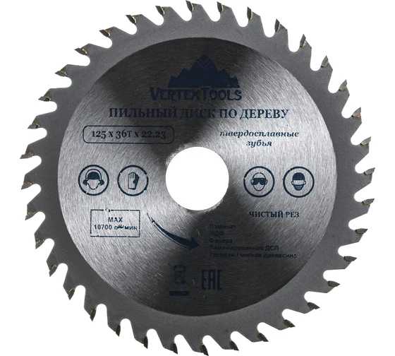 Пильный диск по дереву Vertextools 125-36-22 предназначен для выполнения точных продольных и поперечных чистовых пропилов в мягкой и твердой древесине, прессованной слоистой древесине, фанере, ламинате и ДСП.