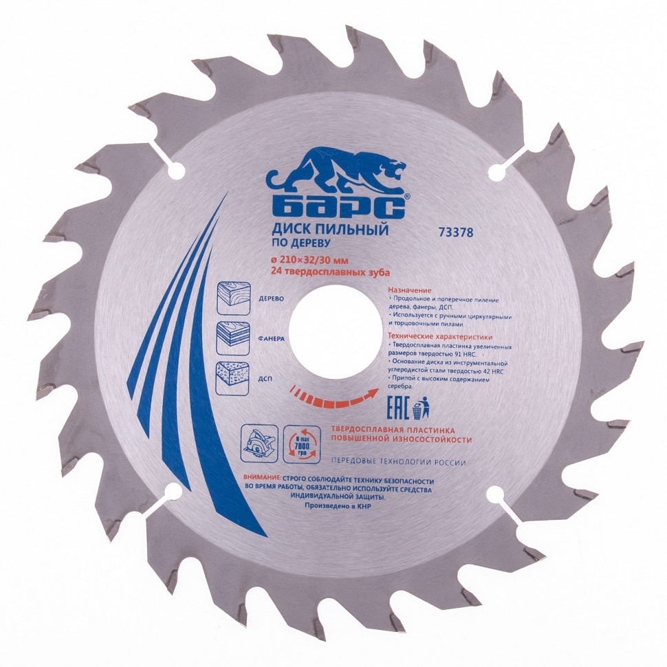 Пильный диск Барс 73378, ф210 х 32 мм, с 24 зубьями и кольцом 32/30 мм предназначен для быстрого пиления древесины мягких и твердых пород, ДСП, МДФ и фанеры. Тип зубьев АТВ и оптимально подобранный угол зуба позволяют производить как продольный, так и поперечный распил. Диск используется совместно с торцовочными и циркулярными пилами с посадкой 32 мм. В комплект входит переходное кольцо на диаметр 30 мм, расширяющее возможности применения оснастки. Диск подходит для интенсивной эксплуатации и может использоваться в профессиональной сфере. Повышенная износостойкость - пластины изготовлены из сплава YG8 твердостью свыше 88 HRА с добавлением легирующих компонентов, формирующих мелкозернистую структуру материала.