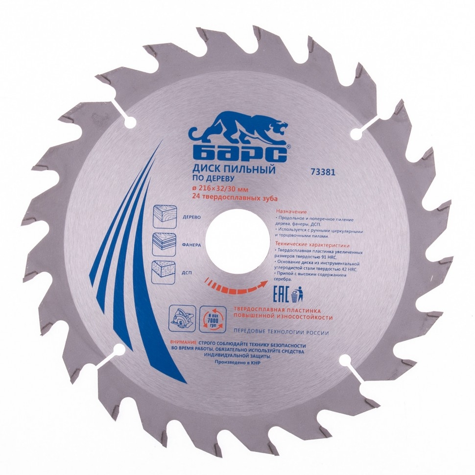Диск пильный по дереву 216х32 мм 24 зуба + кольцо 32/30 мм Барс