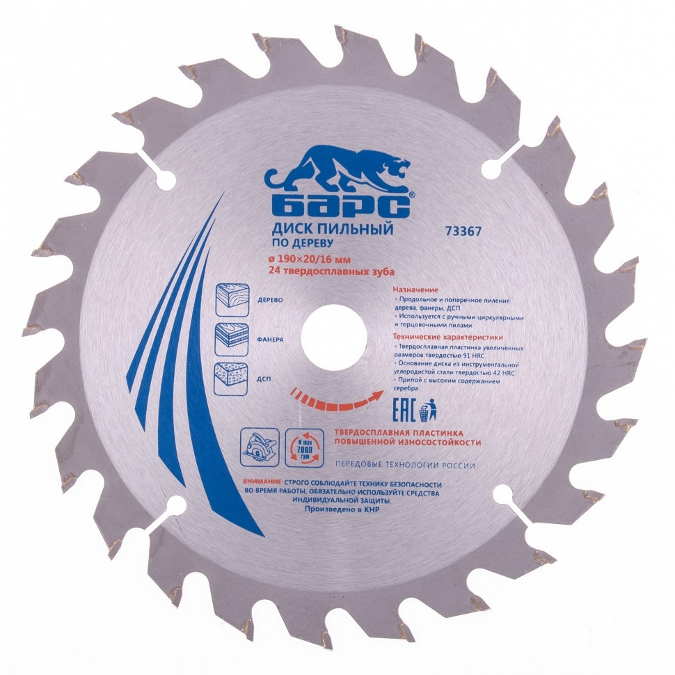 Пильный диск Барс 73354, ф150 х 20 мм, с 24 зубьями и кольцом 20/16 мм предназначен для быстрого пиления древесины мягких и твердых пород, ДСП, МДФ и фанеры. Тип зубьев АТВ и оптимально подобранный угол зуба позволяют производить как продольный, так и поперечный распил. Диск используется совместно с торцовочными и циркулярными пилами с посадкой 20 мм. В комплект входит переходное кольцо на диаметр 16 мм, расширяющее возможности применения оснастки. Диск подходит для интенсивной эксплуатации и может использоваться в профессиональной сфере. Повышенная износостойкость - пластины изготовлены из сплава YG8 твердостью свыше 88 HRА с добавлением легирующих компонентов, формирующих мелкозернистую структуру материала.