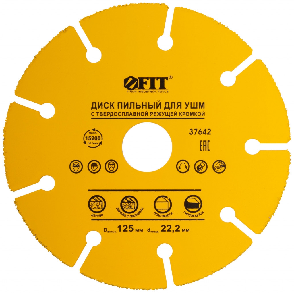 Диск пильныq по дереву для УШМ с карбидной режущей кромкой. Используется для резьбы, зачистки, профилирования, шлифования, нарезки и выборки пазов по дереву, продольного и поперечного реза любых пород дерева; резки дерева с гвоздями, ламината, пластмассы, гипсокартона. Для углошлифовальных машин. Посадочный диаметр 22,2 мм. Специальная форма диска препятствует застреванию в материале. Специально для больших оборотов. Материал: инструментальная сталь, режущая кромка из карбида вольфрама. Упаковка: блистер.