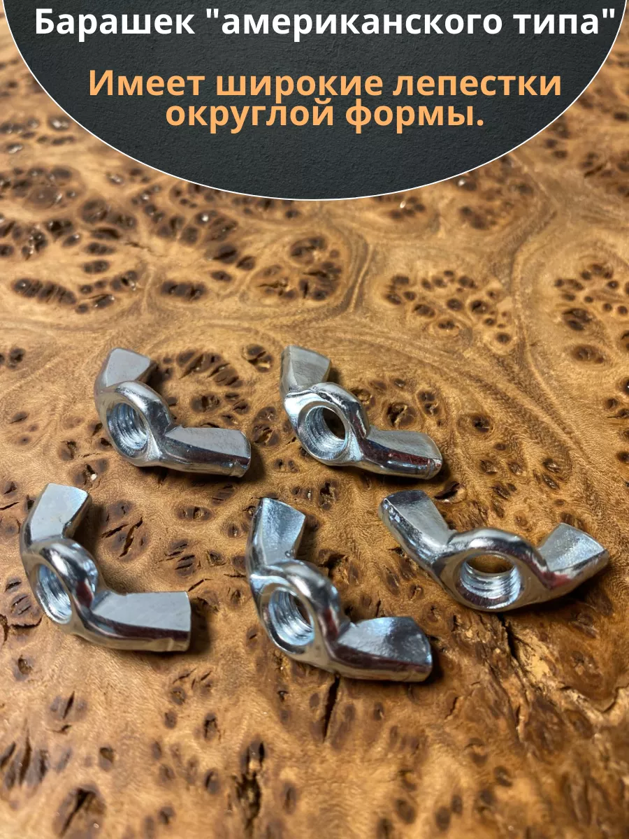 Гайка-барашек – крепежный элемент, имеющий в основе круглое отверстие с метрической резьбой, к которому крепятся два лепестка, вращение которых рукой позволяет затягивать или ослаблять крепление. Потребность в таком крепеже возникает в тех случаях, когда необходимо быстро затянуть или отпустить резьбу крепежа съемной детали, не являющейся элементом несущих конструкций. Изготавливается из оцинкованной или нержавеющей стали.