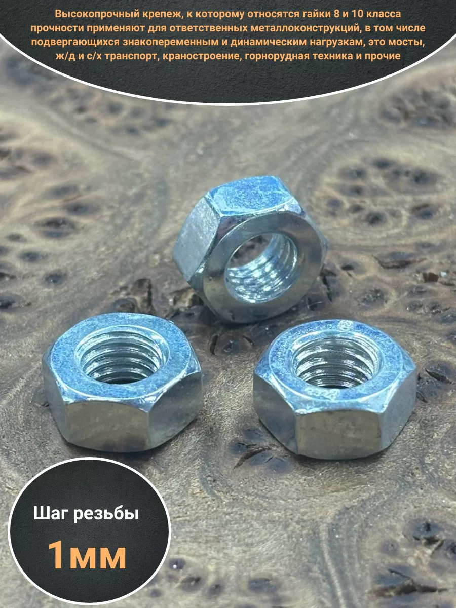 Высокопрочный крепеж, к которому относятся гайки 8 и 10 класса прочности применяют для ответственных металлоконструкций, в том числе подвергающихся знакопеременным и динамическим нагрузкам, это мосты, ж/д и с/х транспорт, краностроение, горнорудная техника и прочие. Для их изготовления применяются легированные стали 35Х, 16ХСН и другие, которые после термообработки приобретают необходимые механические характеристики, позволяющие резьбовому соединению выдерживать осевые растягивающие нагрузки. Чтобы обеспечить надежность конструкции, необходимо использовать высокопрочный крепеж с цинковым покрытием. Это достигается за счет того, что цинк обладает способностью растворяться и образовывать пленку на поврежденных участках.