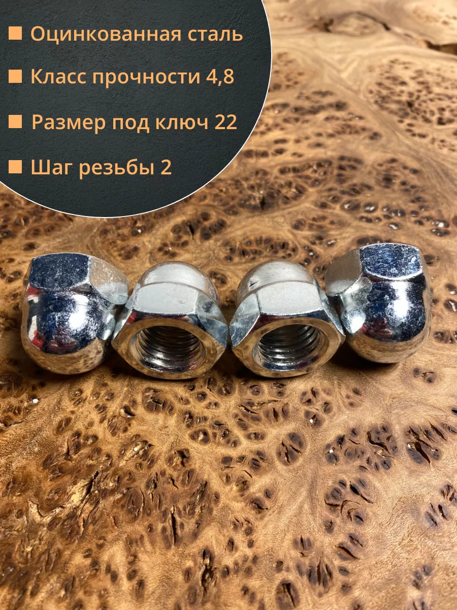 Колпачковая гайка представляет собой сочетание обычной шестигранной гайки и сферического колпачка и предусматривает 2 конструкции – сферические и более плоские. Они различаются между собой глубиной колпачка. Они применяются везде, где требуется красивое и надежное резьбовое соединение. Гайки производятся из углеродистой стали ( с покрытием и без), нержавейки, латуни, алюминия. Стандартом DIN 1587 допускается обработка поверхности гаек для создания защитного никелевого или цинкового слоя.