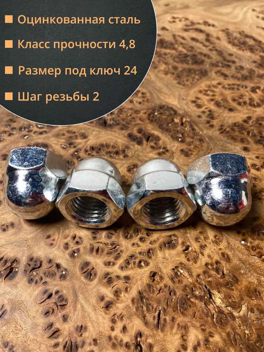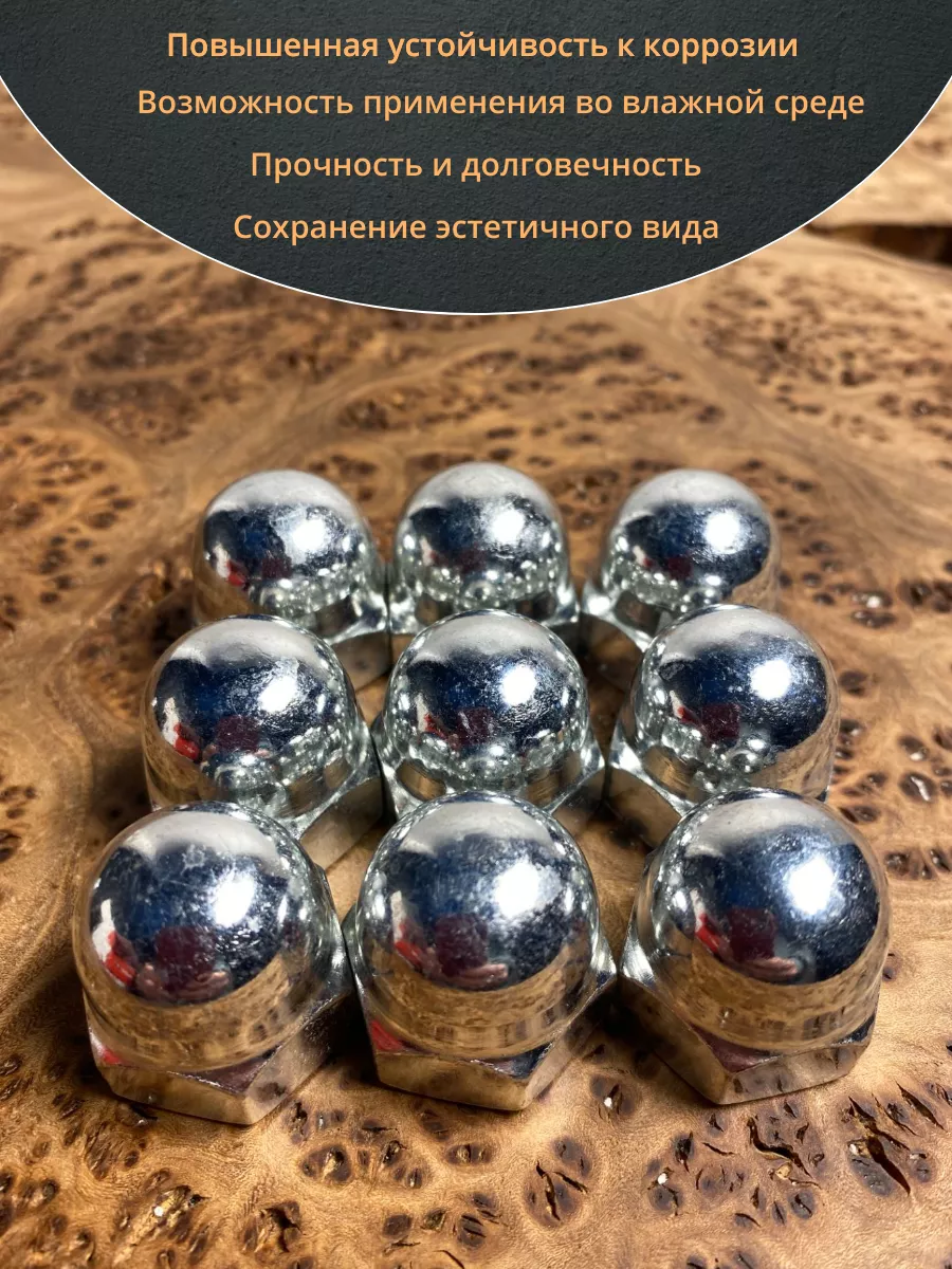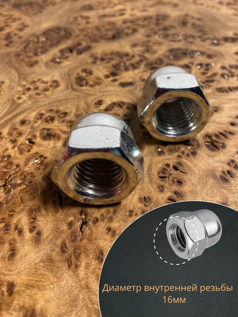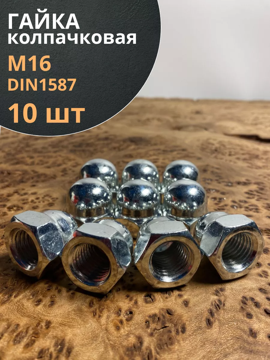 Колпачковая гайка представляет собой сочетание обычной шестигранной гайки и сферического колпачка и предусматривает 2 конструкции – сферические и более плоские. Они различаются между собой глубиной колпачка. Они применяются везде, где требуется красивое и надежное резьбовое соединение. Гайки производятся из углеродистой стали ( с покрытием и без), нержавейки, латуни, алюминия. Стандартом DIN 1587 допускается обработка поверхности гаек для создания защитного никелевого или цинкового слоя.