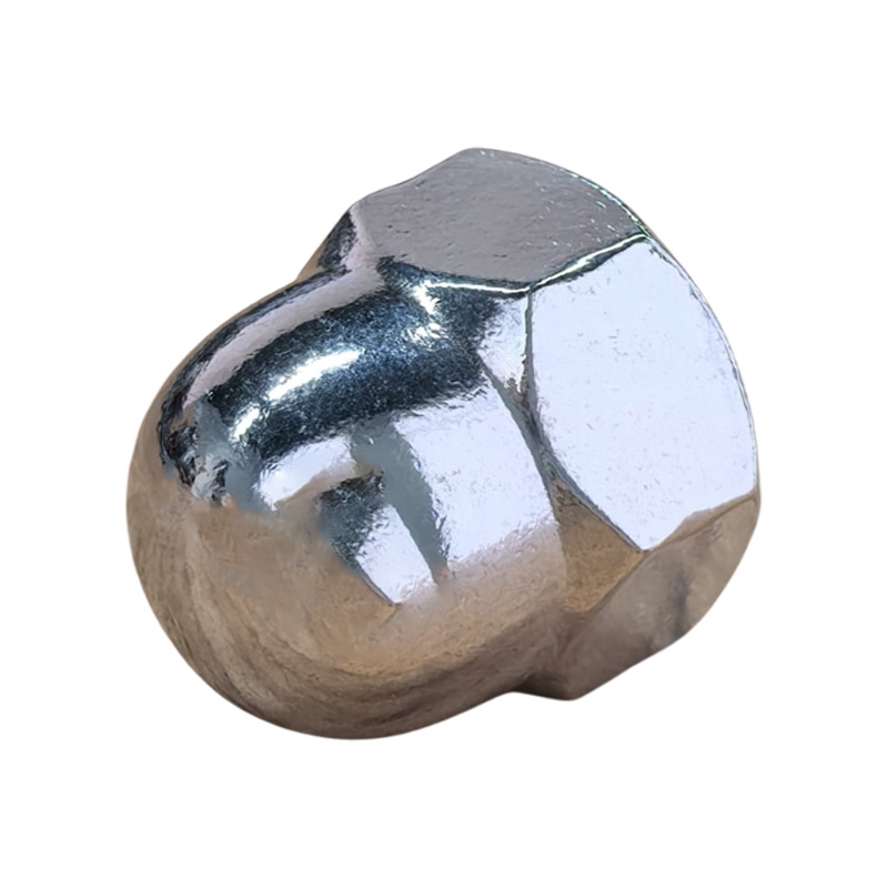Колпачковая гайка представляет собой сочетание обычной шестигранной гайки и сферического колпачка и предусматривает 2 конструкции – сферические и более плоские. Они различаются между собой глубиной колпачка. Они применяются везде, где требуется красивое и надежное резьбовое соединение. Гайки производятся из углеродистой стали ( с покрытием и без), нержавейки, латуни, алюминия. Стандартом DIN 1587 допускается обработка поверхности гаек для создания защитного никелевого или цинкового слоя.