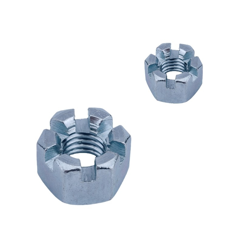 • Шесть прорезей позволяют зафиксировать гайку шплинтом. Это исключает риск ее ослабления при вибрации, ударах или циклических нагрузках, так как шплинт механически блокирует вращение;