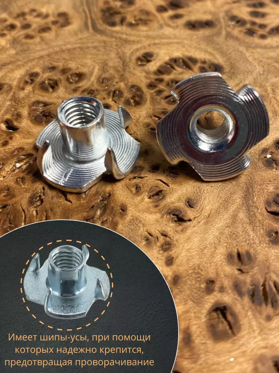Гайка забивная, она же гайка врезная или усовая состоит из цилиндра с внутренней метрической резьбой и фланца с упорными усиками. Длины цилиндра (втулки) достаточно, чтобы гайка и установленный в нее винт создали прочное соединение. Зауженная конструкция усиков на фланце имеет зубчики: такую усовую гайку просто вбить в деревянный элемент, а в дальнейшем при эксплуатации зубчики не позволяют прокручиваться и предотвращают от выпадания из рабочего материала. Это узкоспециализированная гайка, используемая в производстве мебельных конструкций.