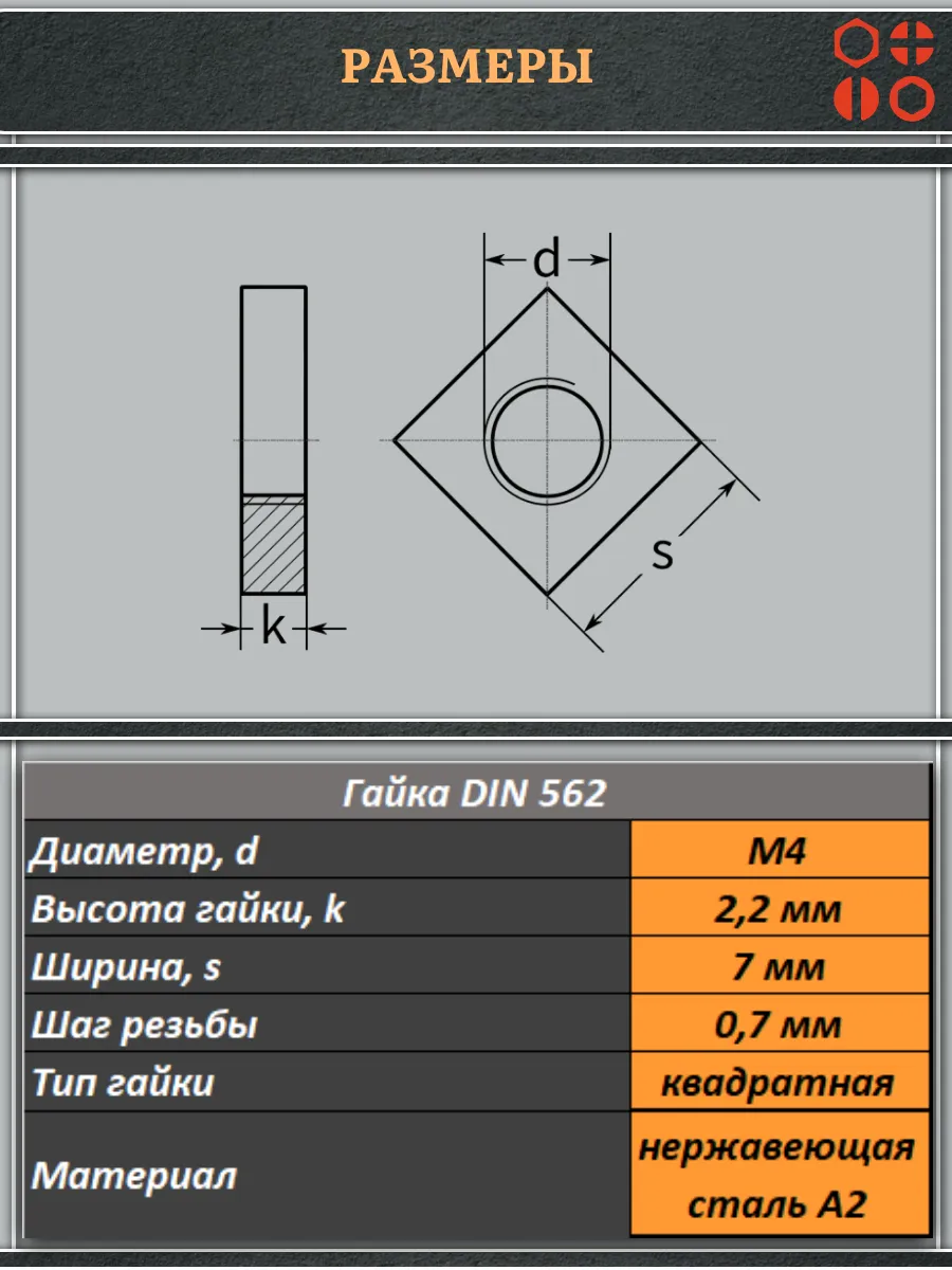 Гайка квадратная М4 нержавеющая низкая DIN562, 10 шт.