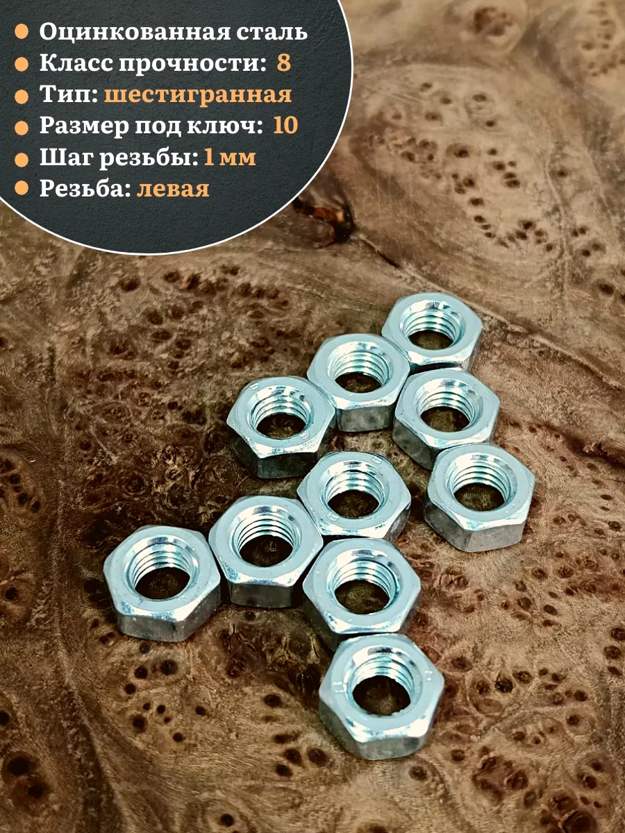 Оцинкованная гайка с левой резьбой М6 DIN 934 LH применяется в резьбовых соединениях, где есть риск самоотворота крепежа с правой резьбой. Изготовлена из стали класса прочности 8.
