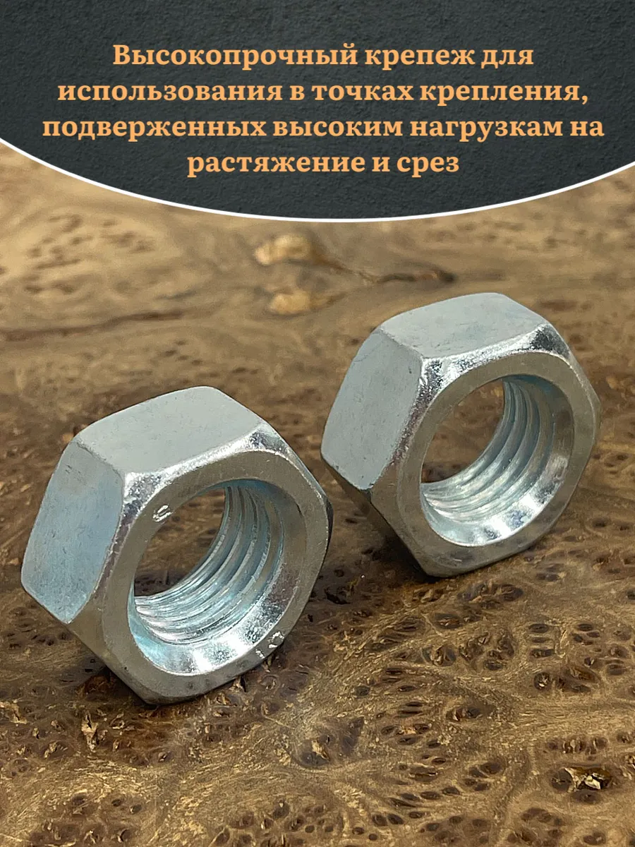 Высокопрочный крепеж, к которому относятся гайки 8 и 10 класса прочности применяют для ответственных металлоконструкций, в том числе подвергающихся знакопеременным и динамическим нагрузкам, это мосты, ж/д и с/х транспорт, краностроение, горнорудная техника и прочие. Для их изготовления применяются легированные стали 35Х, 16ХСН и другие, которые после термообработки приобретают необходимые механические характеристики, позволяющие резьбовому соединению выдерживать осевые растягивающие нагрузки. Чтобы обеспечить надежность конструкции, необходимо использовать высокопрочный крепеж с цинковым покрытием. Это достигается за счет того, что цинк обладает способностью растворяться и образовывать пленку на поврежденных участках.