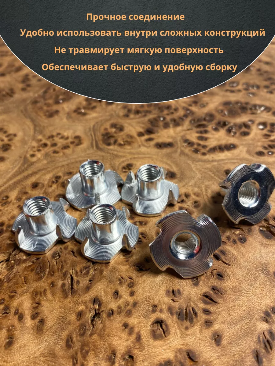 Гайка забивная, она же гайка врезная или усовая состоит из цилиндра с внутренней метрической резьбой и фланца с упорными усиками. Длины цилиндра (втулки) достаточно, чтобы гайка и установленный в нее винт создали прочное соединение. Зауженная конструкция усиков на фланце имеет зубчики: такую усовую гайку просто вбить в деревянный элемент, а в дальнейшем при эксплуатации зубчики не позволяют прокручиваться и предотвращают от выпадания из рабочего материала. Это узкоспециализированная гайка, используемая в производстве мебельных конструкций.