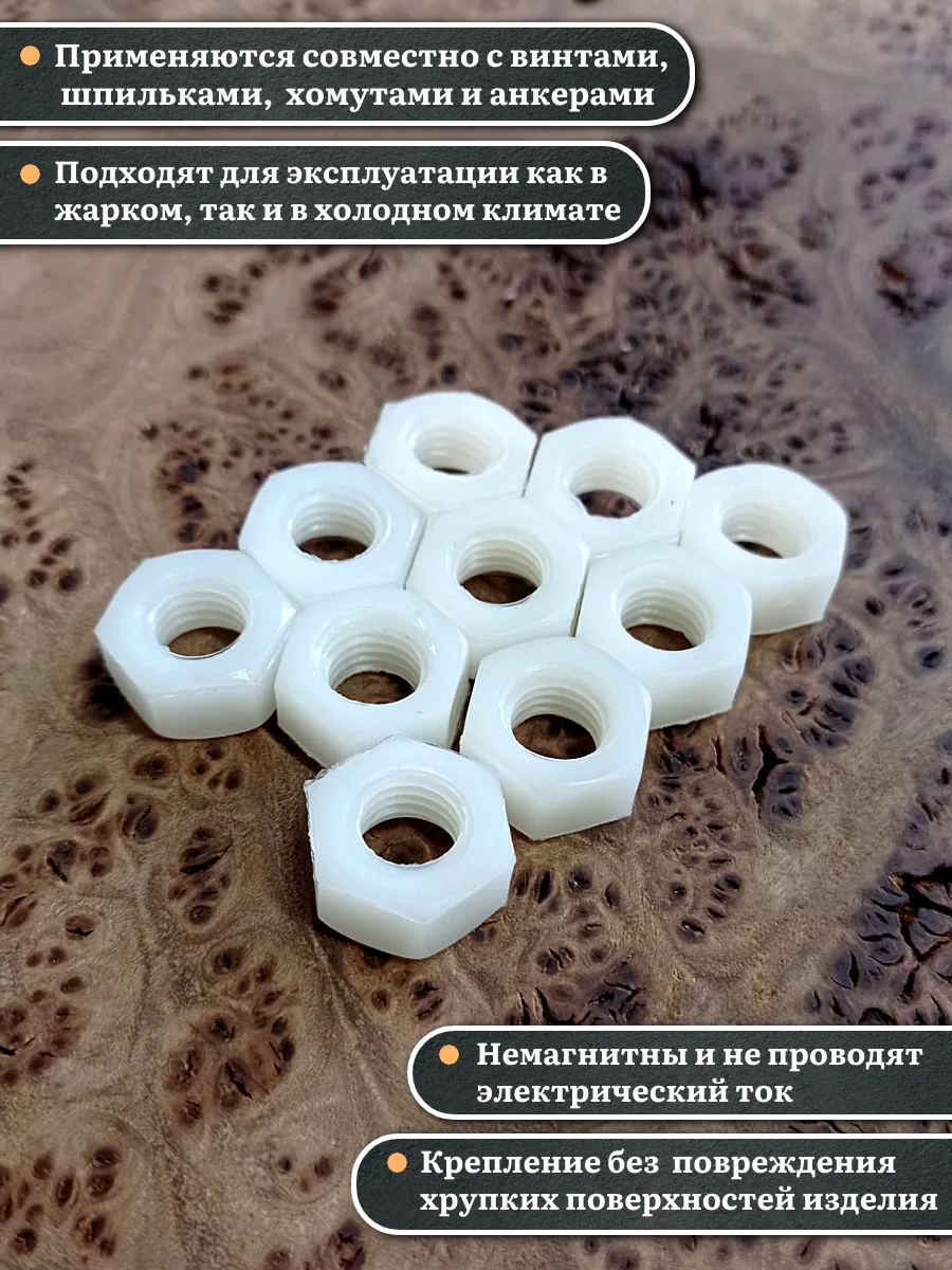 Гайки из пластика, изготовленные из полиамида и соответствующие стандарту DIN 934, используются для предотвращения самопроизвольного раскручивания резьбовых соединений. Вместе с ними применяют полиамидные шайбы, которые служат в качестве уплотнительной прокладки. Это позволяет увеличить площадь контакта и защитить соединяемые детали от повреждений.