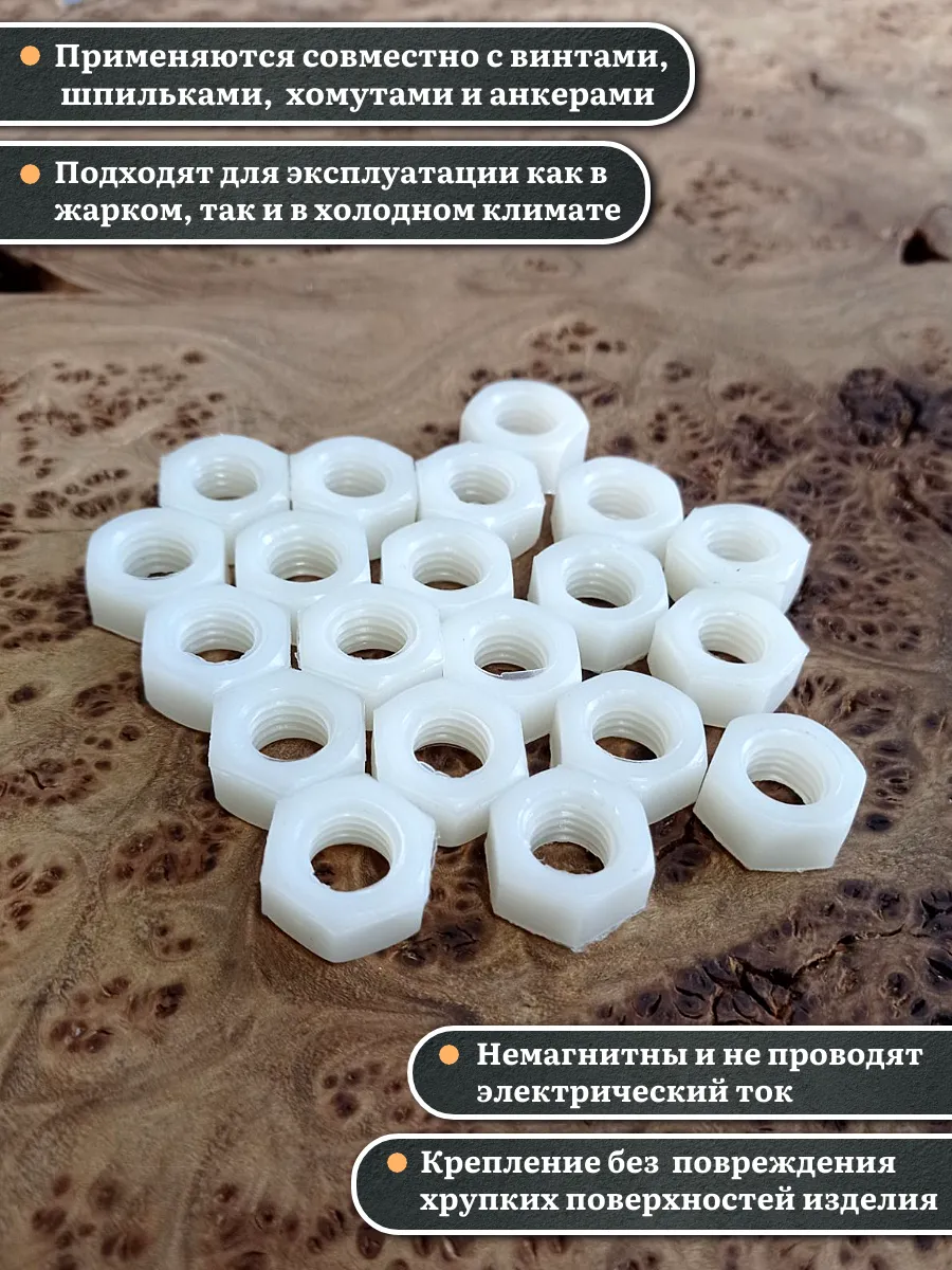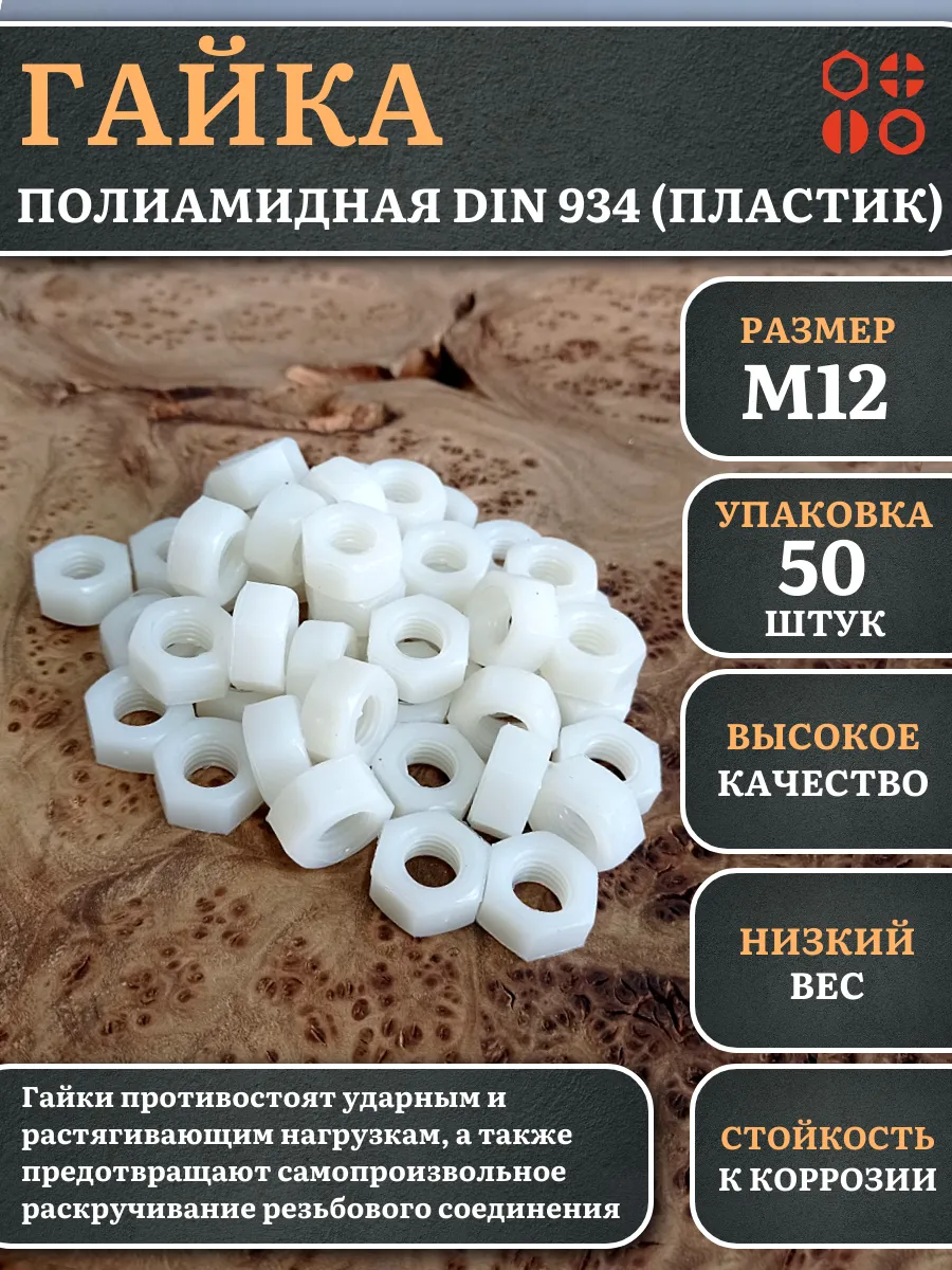 Гайки из пластика, изготовленные из полиамида и соответствующие стандарту DIN 934, используются для предотвращения самопроизвольного раскручивания резьбовых соединений. Вместе с ними применяют полиамидные шайбы, которые служат в качестве уплотнительной прокладки. Это позволяет увеличить площадь контакта и защитить соединяемые детали от повреждений.