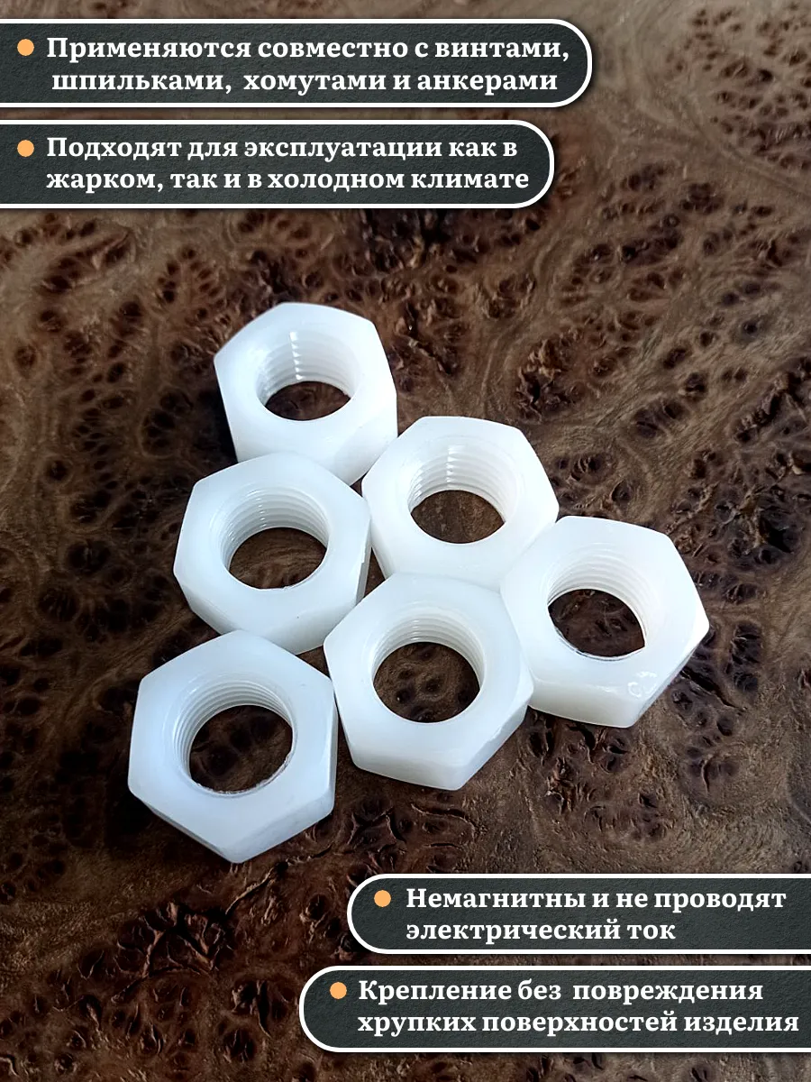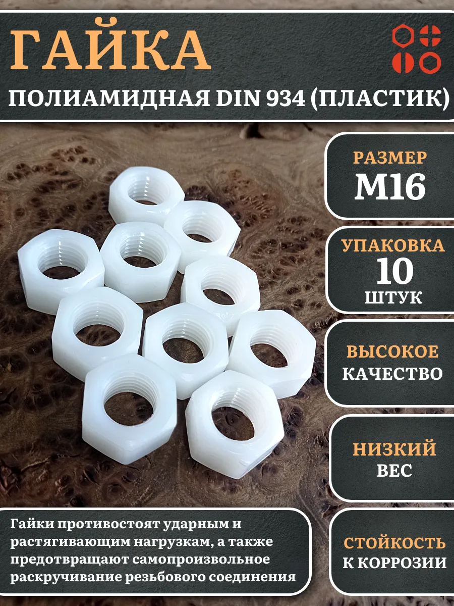 Гайки из пластика, изготовленные из полиамида и соответствующие стандарту DIN 934, используются для предотвращения самопроизвольного раскручивания резьбовых соединений. Вместе с ними применяют полиамидные шайбы, которые служат в качестве уплотнительной прокладки. Это позволяет увеличить площадь контакта и защитить соединяемые детали от повреждений.