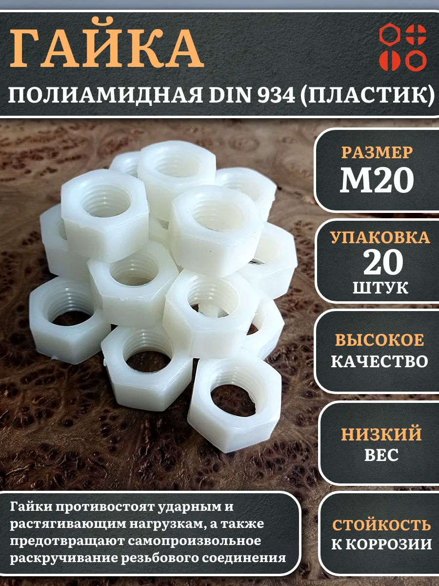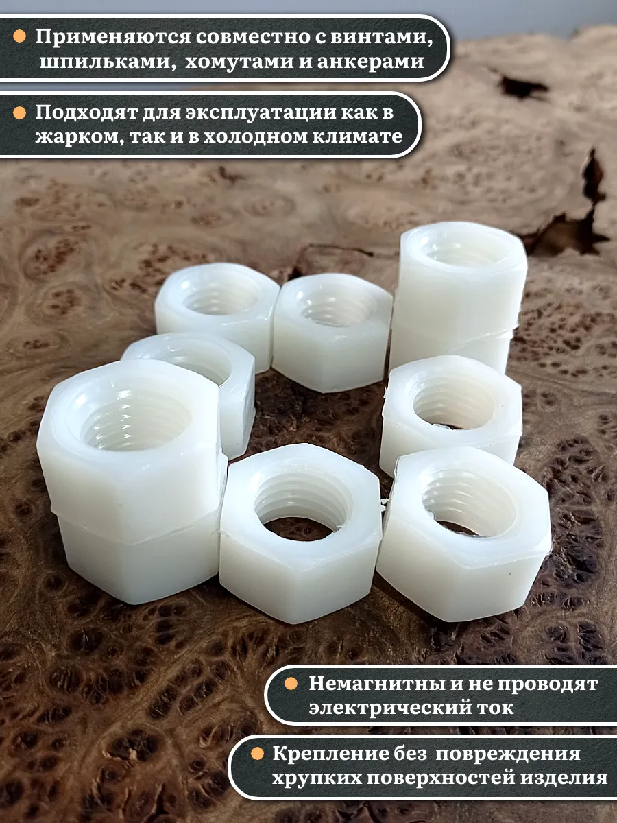 Гайки из пластика, изготовленные из полиамида и соответствующие стандарту DIN 934, используются для предотвращения самопроизвольного раскручивания резьбовых соединений. Вместе с ними применяют полиамидные шайбы, которые служат в качестве уплотнительной прокладки. Это позволяет увеличить площадь контакта и защитить соединяемые детали от повреждений.